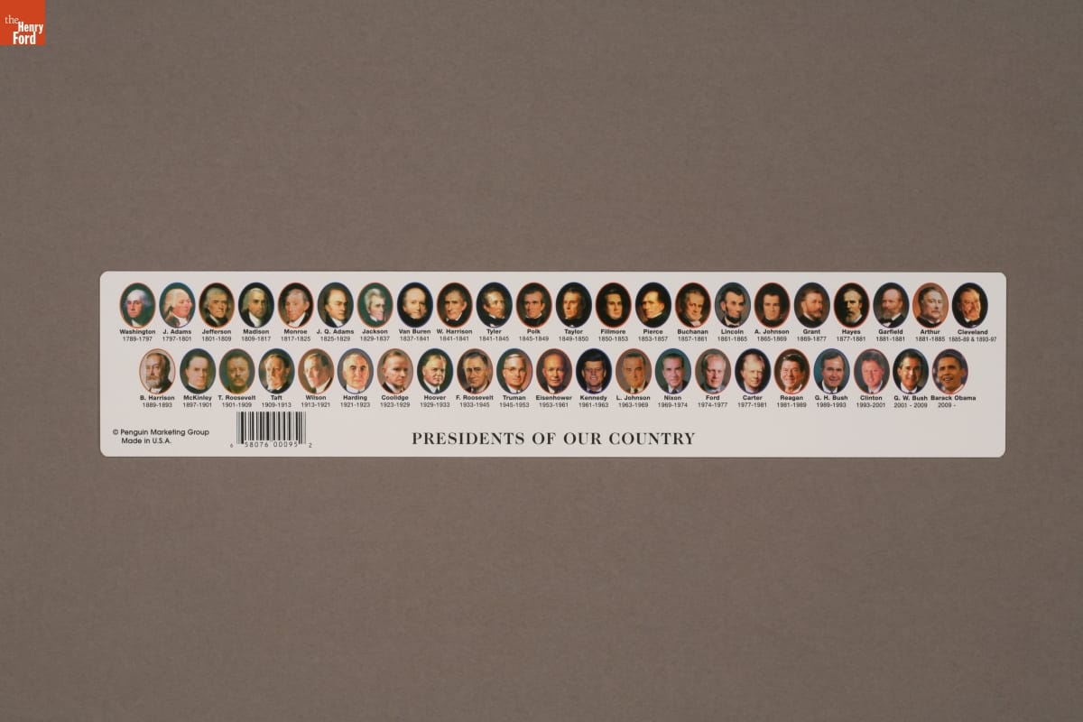 This souvenir ruler provides a glimpse of the continuity and change in our American democracy. The list of presidents and their terms of service documents the unbroken line of peaceful transitions that began over two-hundred years ago; while the image of our 44th President points to the country's growing cultural diversity. How do you think our democracy has measured up?