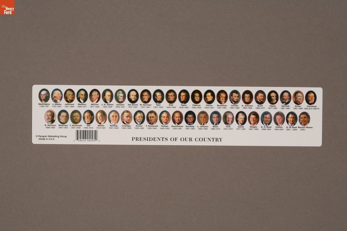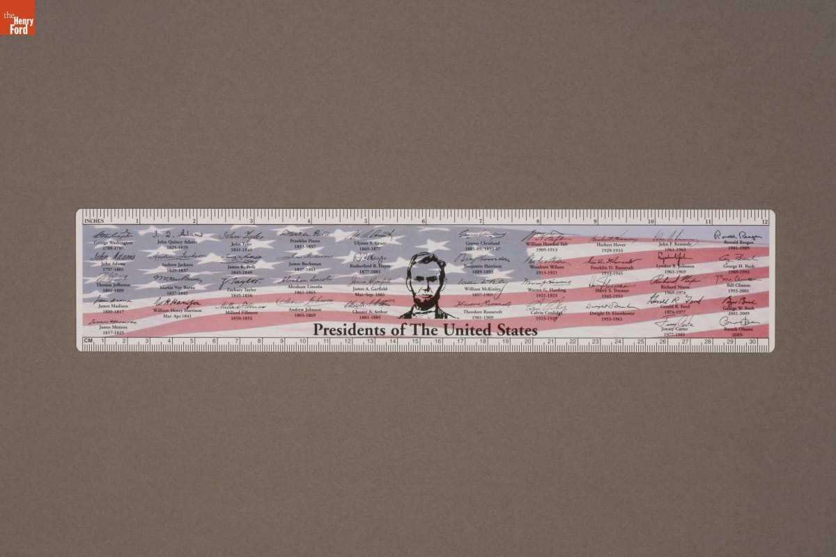 This souvenir ruler provides a glimpse of the continuity and change in our American democracy. The list of presidents and their terms of service documents the unbroken line of peaceful transitions that began over two-hundred years ago; while the image of our 44th President points to the country's growing cultural diversity. How do you think our democracy has measured up?