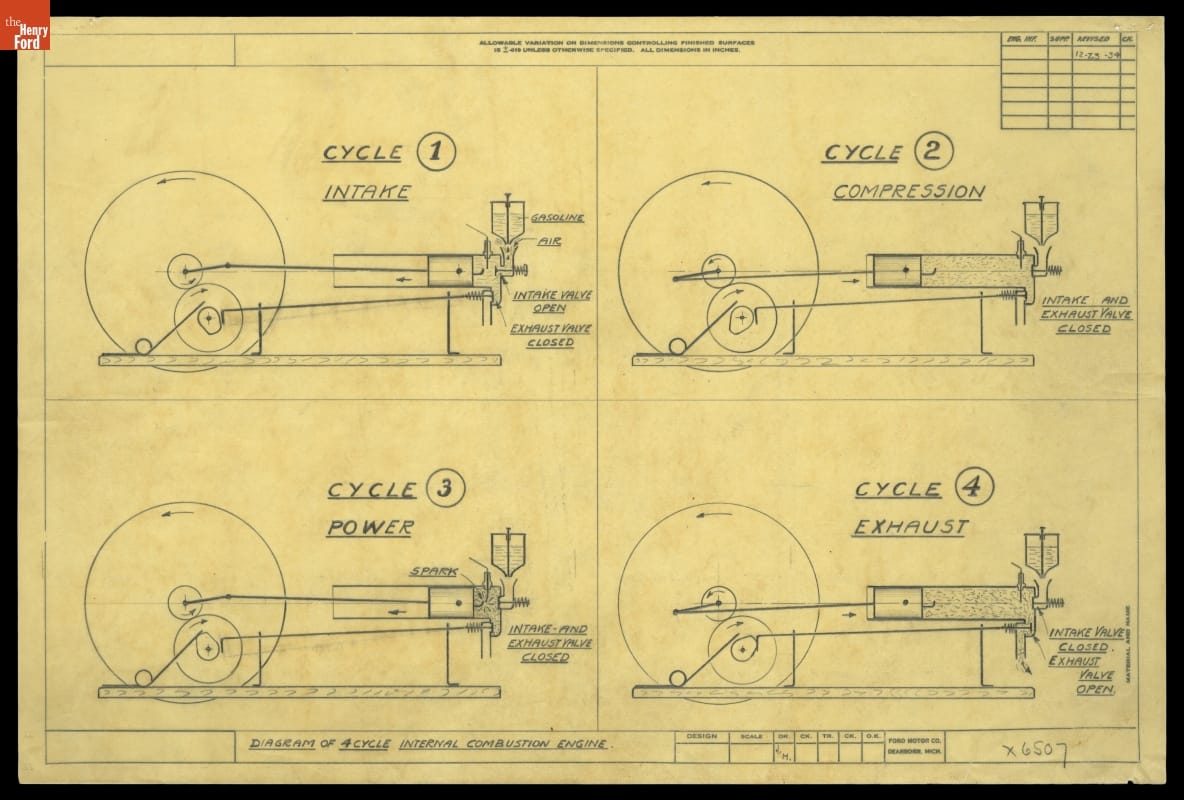 This 1934 diagram uses Henry Ford's experimental 1893 Kitchen Sink Engine to illustrate the operation of a four-stroke internal combustion engine. Stroke one draws air and fuel into the cylinder. Stroke two compresses the air-fuel mixture. In the power stroke, a spark ignites the mixture which forces the piston down, turning the crankshaft. Stroke four pushes exhaust from the cylinder.