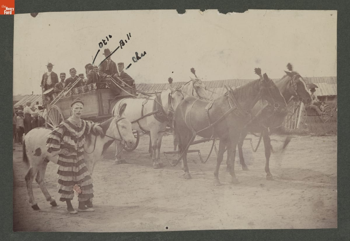 Small traveling circuses in the late 19th and early 20th century arrived in towns with great fanfare. Performers, animals and musicians paraded down streets. This free publicity, circus owners hoped, would arouse the interest of the residents and potential customers. This photograph shows the Wixom Brothers Circus marching to the fairgrounds in Ithaca, Michigan.