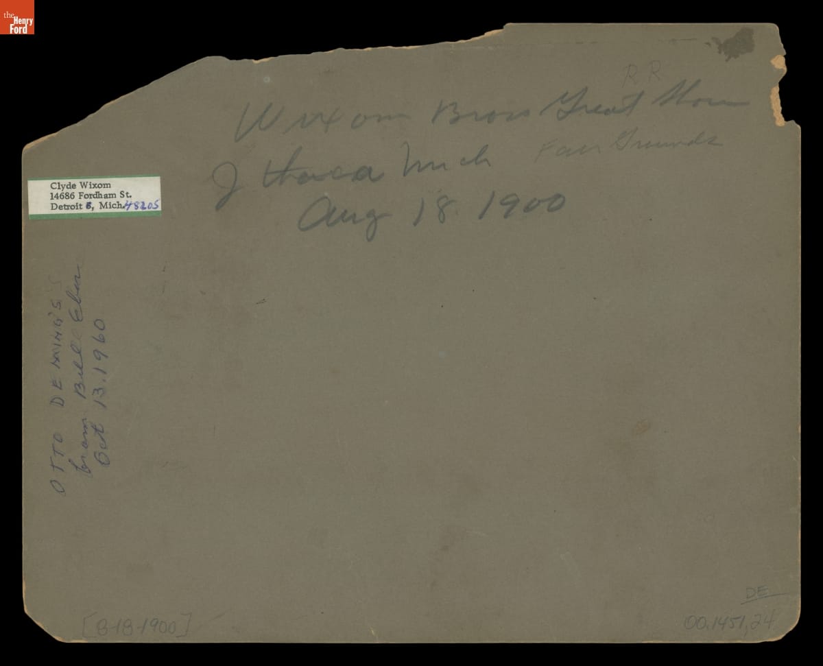 Handwritten in pencil on back: Wixom Bros Great Show / J / Ithaca Mich Fair Grounds |/ Aug 18, 1900 / [note: the term RR is added into the line with a different pencil above the words]