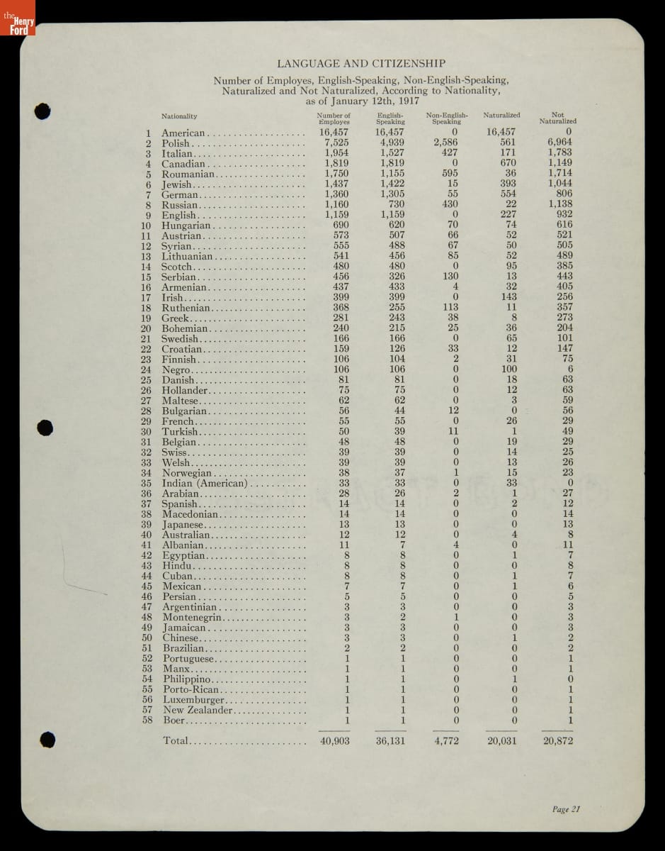 Language and Citizenship of Ford Motor Company Employees, According to Nationality, as of January 12th, 1917