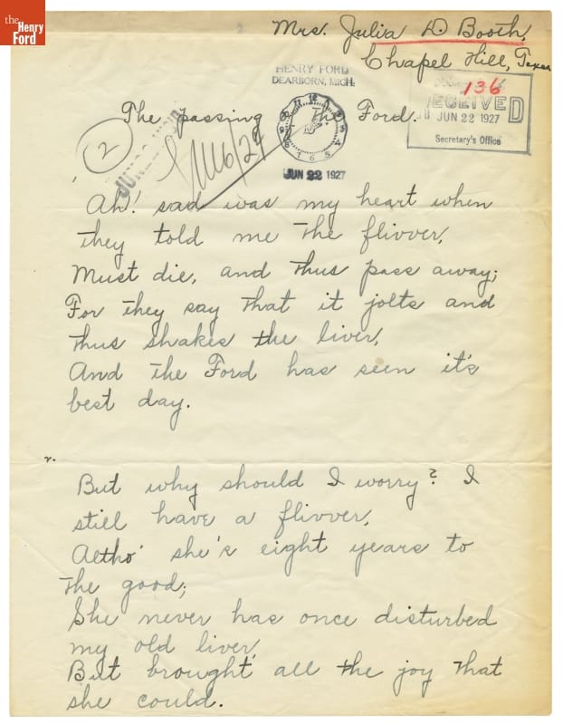 Julia D. Booth of Chapel Hill, Texas, sent Henry Ford a three-page poem that revealed her love of the Model T and the car's popularity. On May 26, 1927, Ford Motor Company ceased production of the Model T in favor of the new Model A, which began production on November 1, 1927. Ford sold 15 million Model T cars from 1908-1927.
