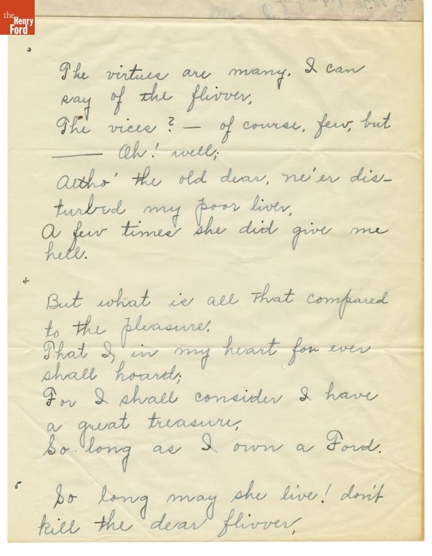 But what is all that compared / to the pleasure, / That I in my heart for ever / shall hoard; / For I shall consider I have / a great treasure, / So long as I own a Ford.