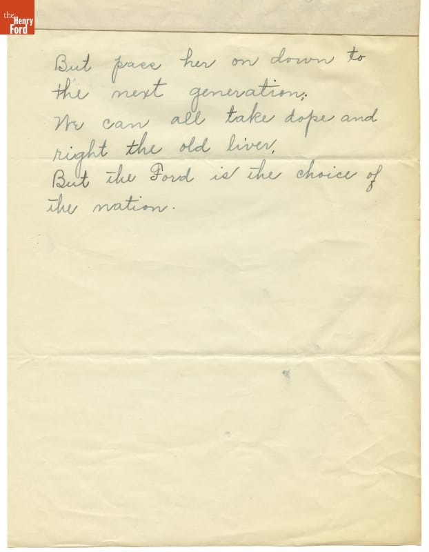 So long may she live! don't / kill the dear flivver. / But pass her on down to / the next generation; / We can all take dope and / right the old liver, / But the Ford is the choice of / the nation.