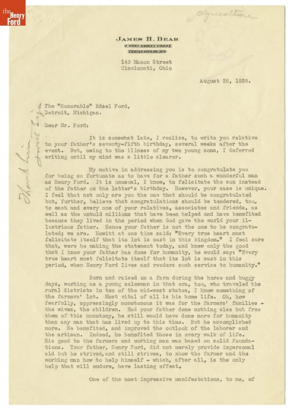 Letter from James H. Bear to Edsel Ford Praising Henry Ford and the Model T, 1938