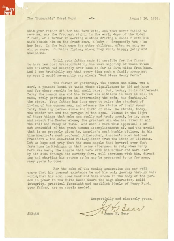 In his letter to Edsel Ford, James H. Bear praised Henry Ford and wrote of the freedom that the Model T provided, especially to rural families. Bear, like many people, saw Henry Ford as a visionary and leader with ideal characteristics needed to be successful in future generations.
