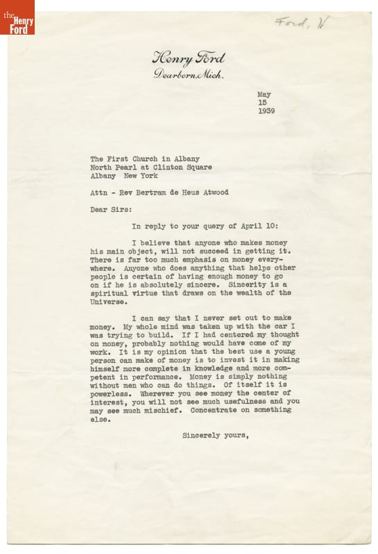 Letter from Henry Ford to Reverend Atwood, with Thoughts on the Value of Money, 1939