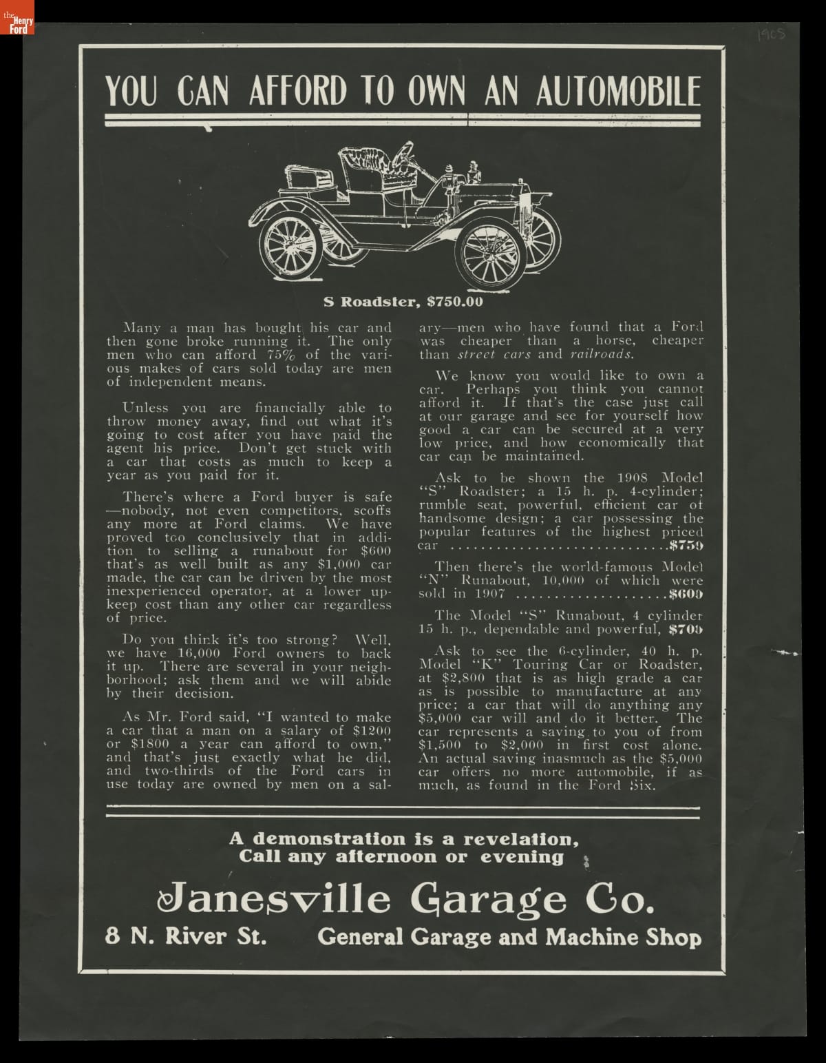 Even before Ford introduced its low-priced Model T in late 1908, the company emphasized affordability. This ad touts the hot-selling Models N, R, and S, none priced higher than $750. It also claims that the slow-selling Model K, priced at $2,800, "will do anything any $5,000 car will, and do it better."