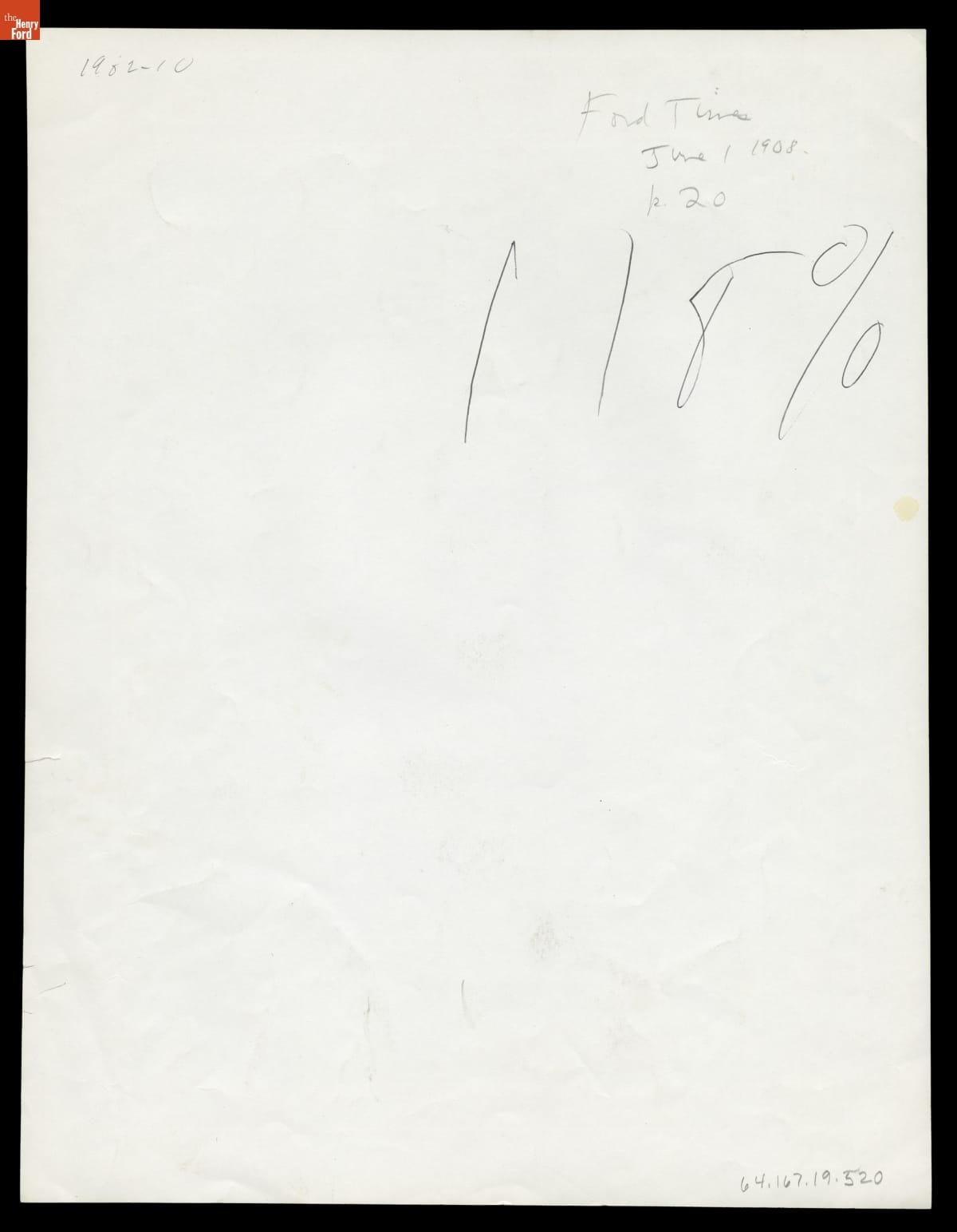 Handwritten on back: Ford Times / June 1, 1908 / p.20 / 118%