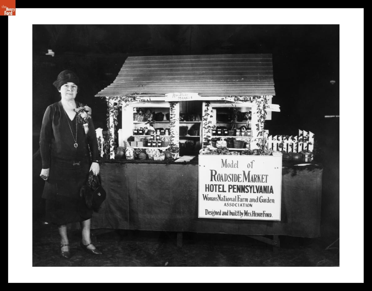 Clara Ford tried to help rural farm women during her presidency of the National Woman's Farm & Garden Association. She developed a design for a neat but inexpensive roadside market building that could show off fresh farm produce. She promoted her idea at garden shows around the country, including this one at the Hotel Pennsylvania in New York City.