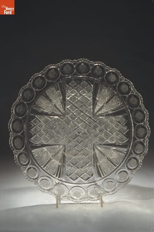 Mechanically pressed glass was an innovation in glass history, making decorative, "patterned" glass available to a broad audience. One of the earliest types of pressed glass, dating to the 1830s is known as "Lacy Glass". Complex stippled patterns were developed to help hide technical defects caused by early presses, when the glass gather was cut off and dropped into a mold.