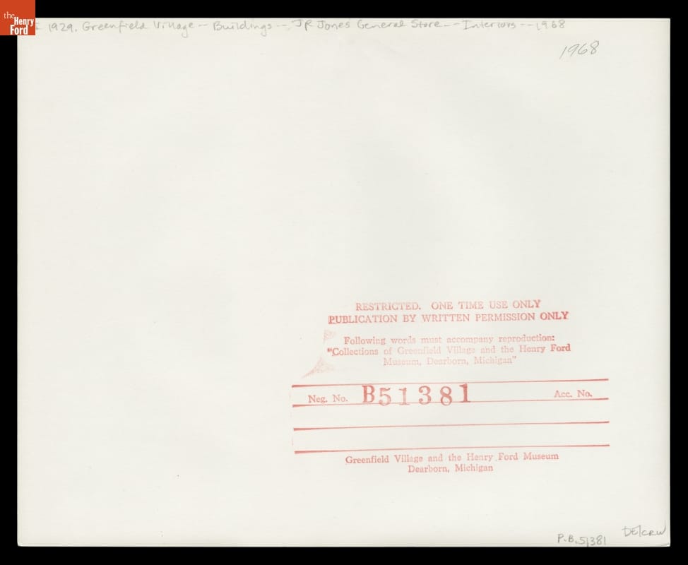 Red ink stamp on back: RESTRICTED. ONE TIME USE ONLY / PUBLICATION BY WRITTEN PERMISSION ONLY / Folowing words must accompany reproductions / "Collections of Greenfield Village and the Henry Ford / Museum, Dearborn, Michigan"...