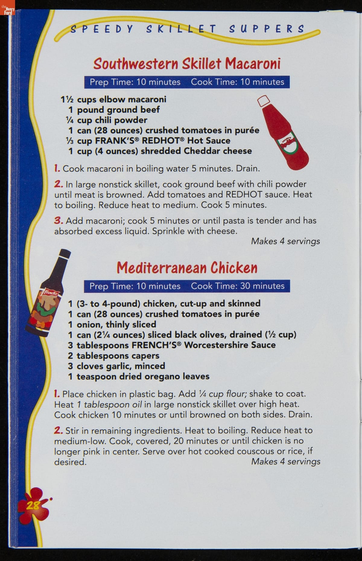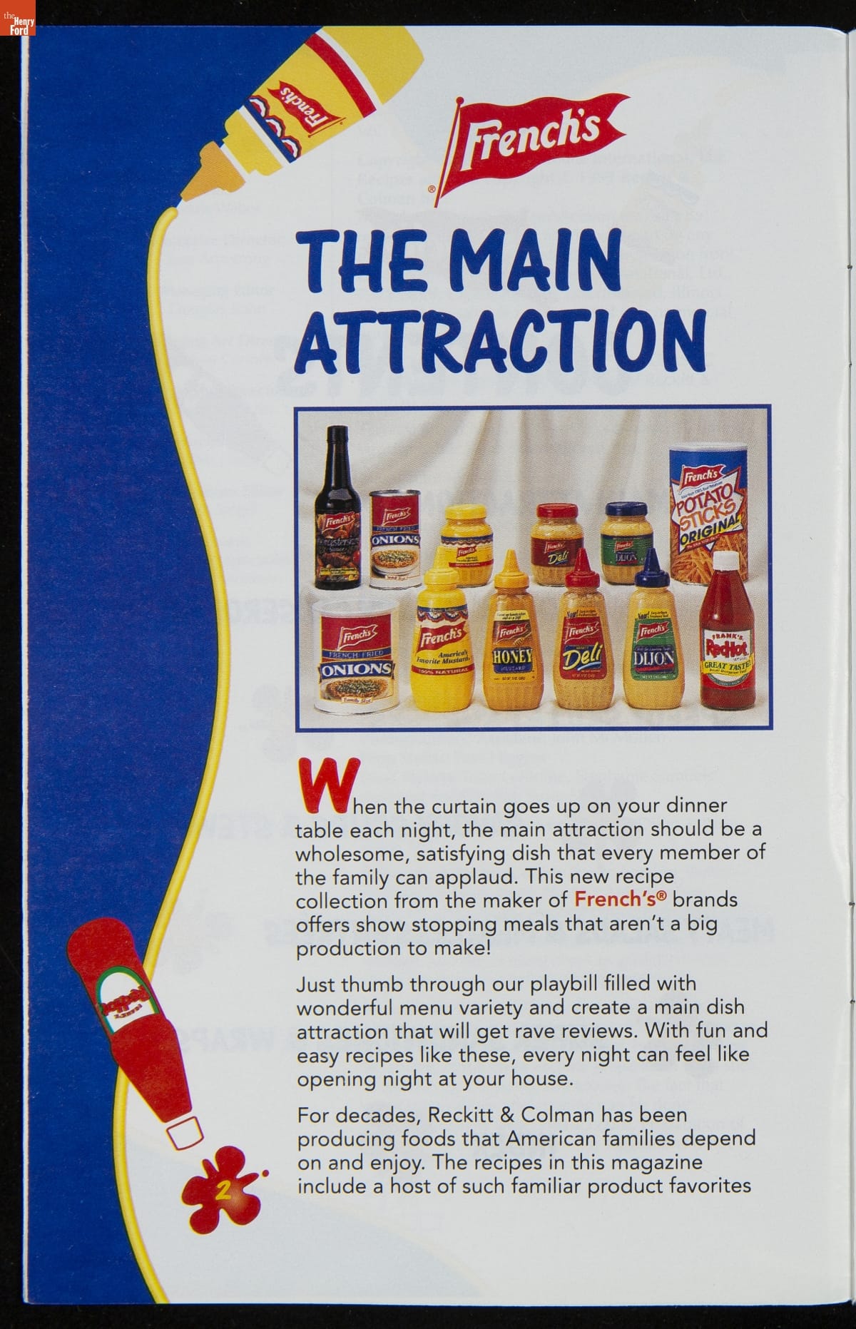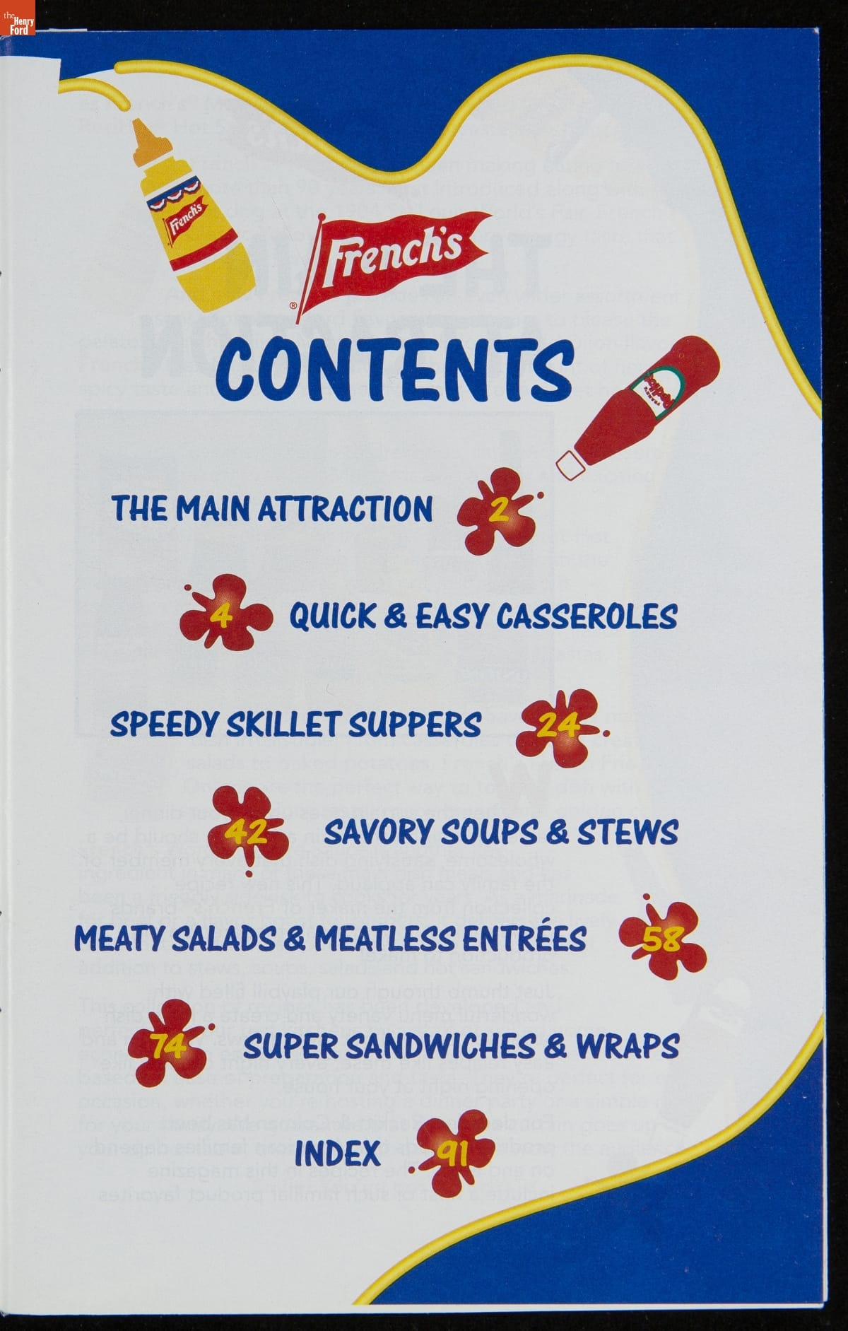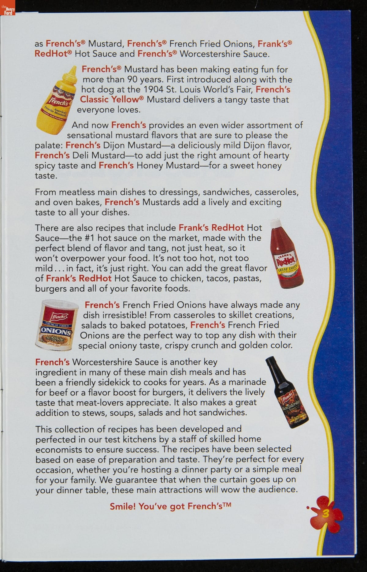The R.T. French Company debuted its first condiment (Cream Salad Mustard) in 1904 at the Louisiana Purchase Exposition in St. Louis, Missouri. Since then, the French's brand has expanded to include a wide variety of condiments and food items. This recipe booklet from 1999 features creative one-dish meals utilizing French's products.