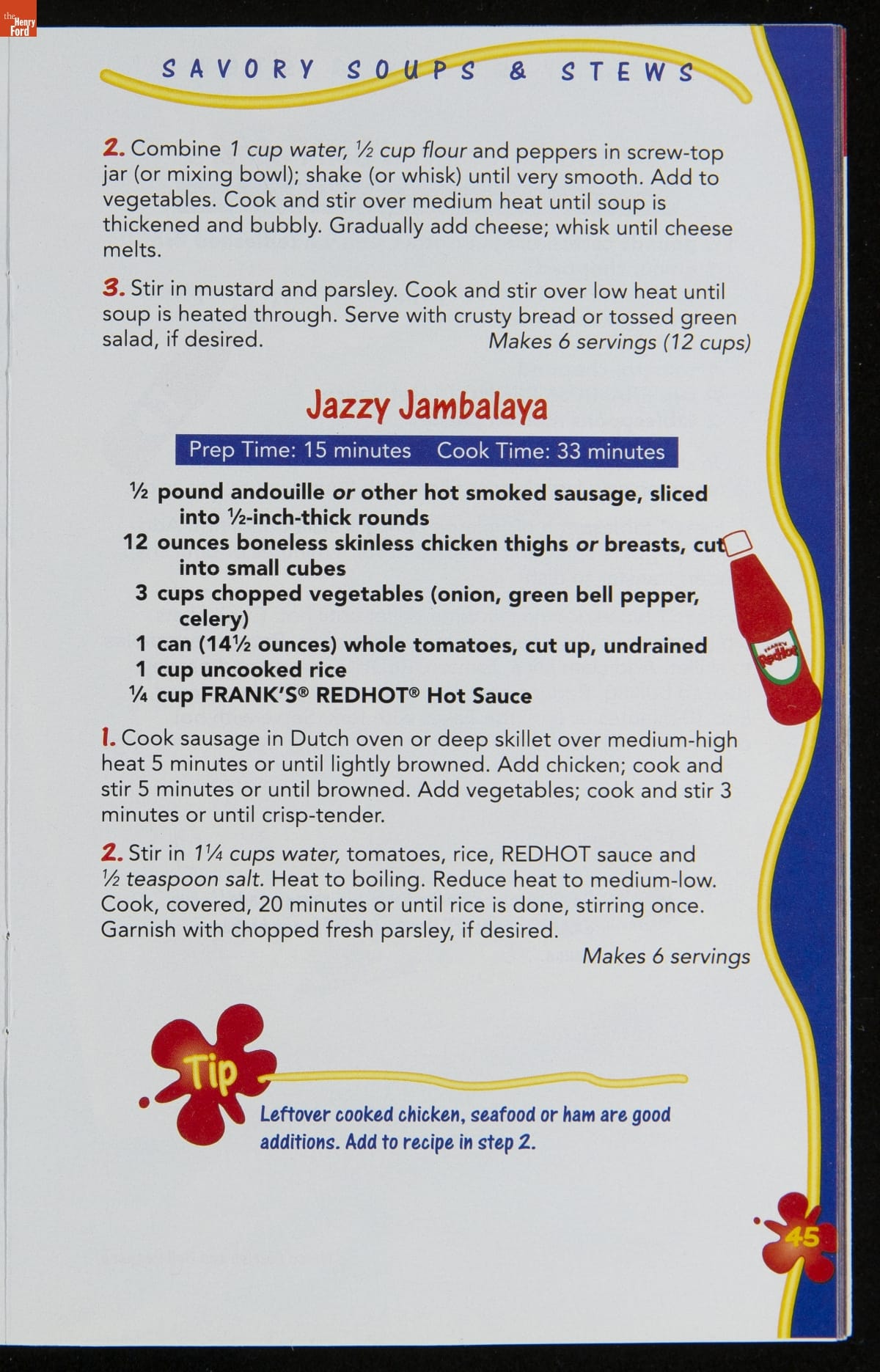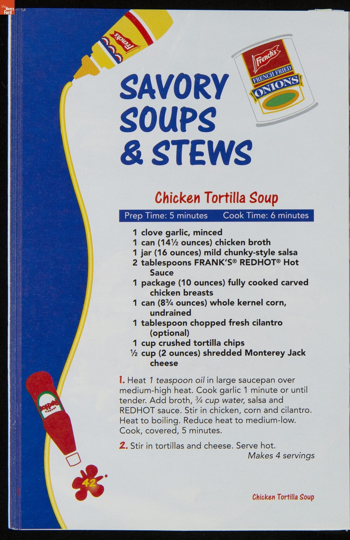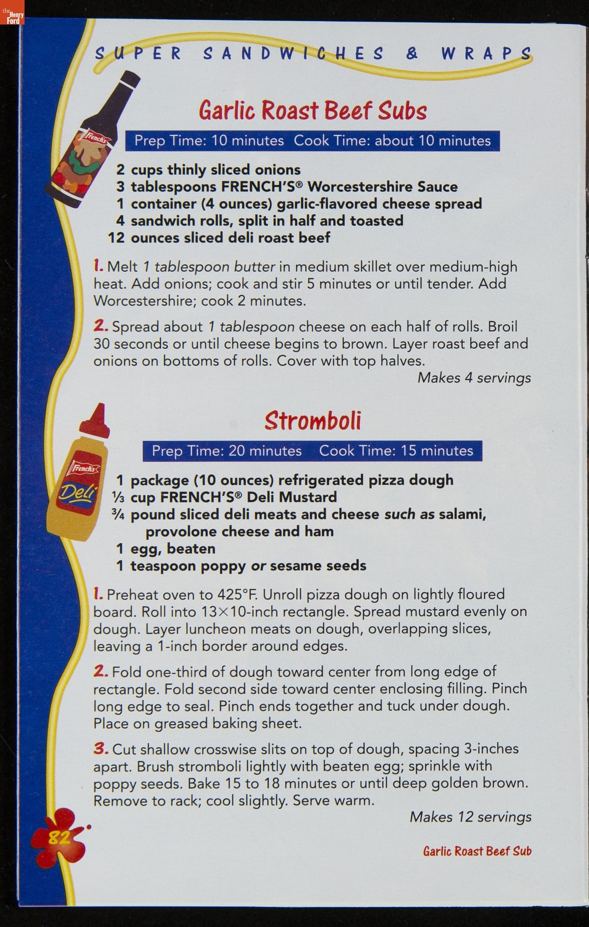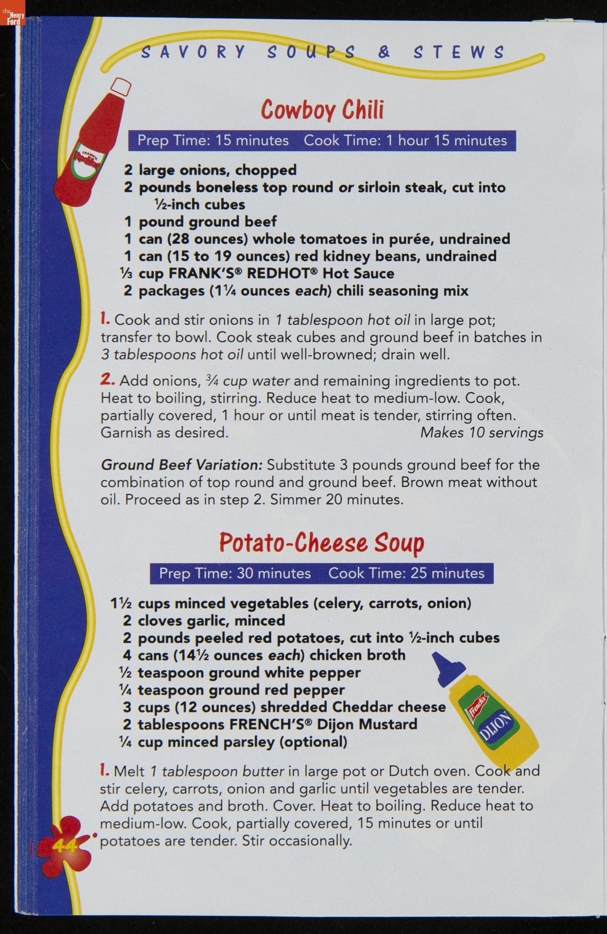 The R.T. French Company debuted its first condiment (Cream Salad Mustard) in 1904 at the Louisiana Purchase Exposition in St. Louis, Missouri. Since then, the French's brand has expanded to include a wide variety of condiments and food items. This recipe booklet from 1999 features creative one-dish meals utilizing French's products.