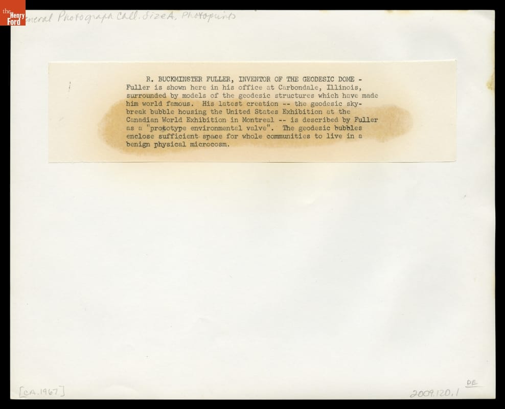 R. BUCKMINSTER FULLER, INVENTOR OF THE GEODESIC DOME-- / Fuller is shown here in his office at Carbondale, Illinois, / surrounded by models of the geodesic structures which have made / him world famous. His latest creation-- the geodesic sky- / break bubble housing the United States Exhibition at the / Canadian World Exhibition in Montreal-- is described by Fuller / as a "prototype environmental valve". The geodesic bubbles / enclose sufficient space for whole communities to live in a a/ benign physical microcosm.