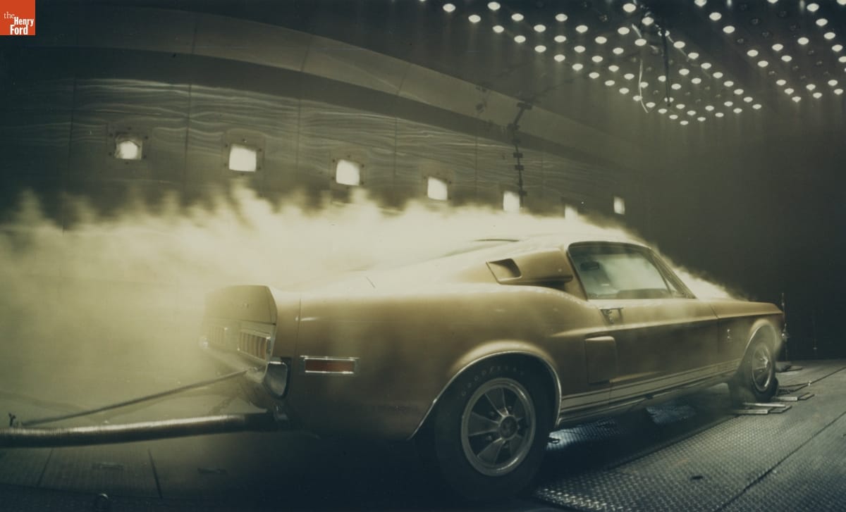 Wind tunnels are chambers that use flowing air to test the aerodynamic properties of an object. Automotive stylists and engineers use the results of wind tunnel testing to design motor vehicle chassis. This photograph shows a wind tunnel test of a 1967 Shelby Mustang. Shelby American built these high performance versions of Ford's Mustang in the late 1960s.