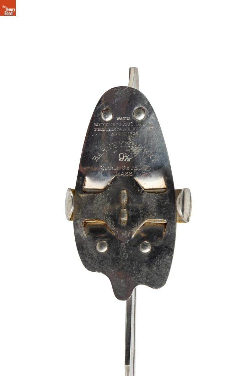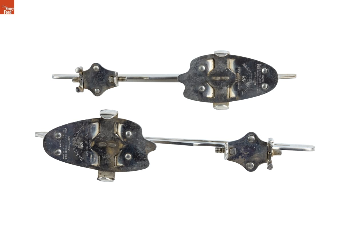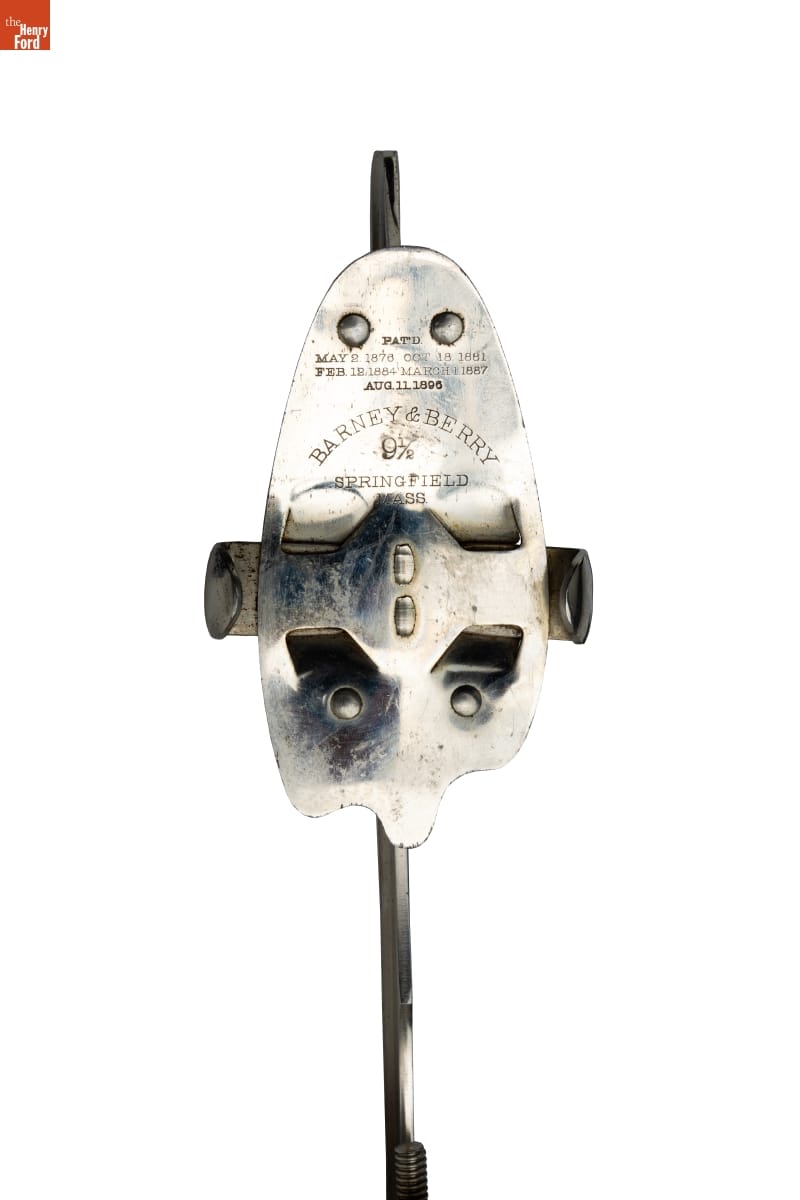 Skates with wooden platforms cracked and needed frequent repairs. Manufacturers began developing metal skates in the 1870s and 1880s, but initially these skates still required straps and buckles. Eventually all-metal clamps and screws successfully held the skates to your shoes. In the 1890s, Barney & Berry patented this skate that could be "stepped into" and hooked around your shoes.