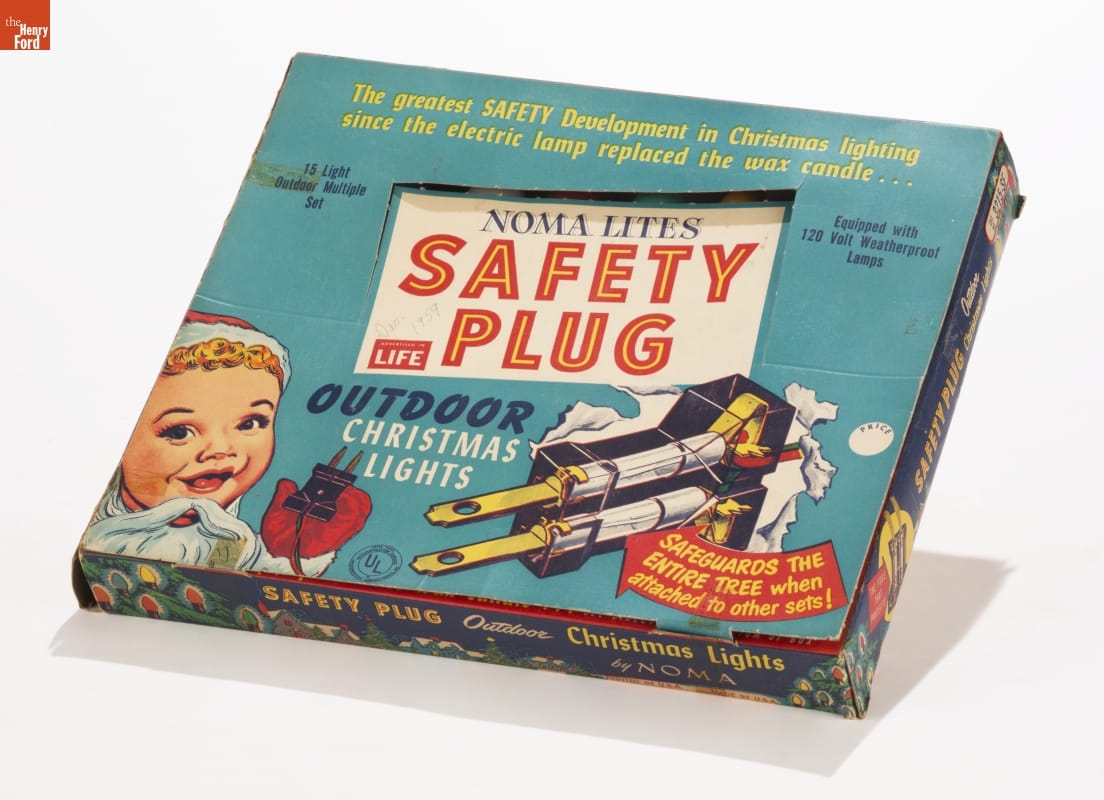 The greatest SAFETY Development in Christmas lighting / since the electric lamp replaced the candle.../ NOMA LITES / SAFETY / PLUG / ADVERTISED / IN / LIFE / 15 Light / Outdoor Multiple / Set / OUTDOOR / CHRISTMAS / LIGHTS / SAFEGUARDS THE / ENTIRE TREE when / attached to other sets!