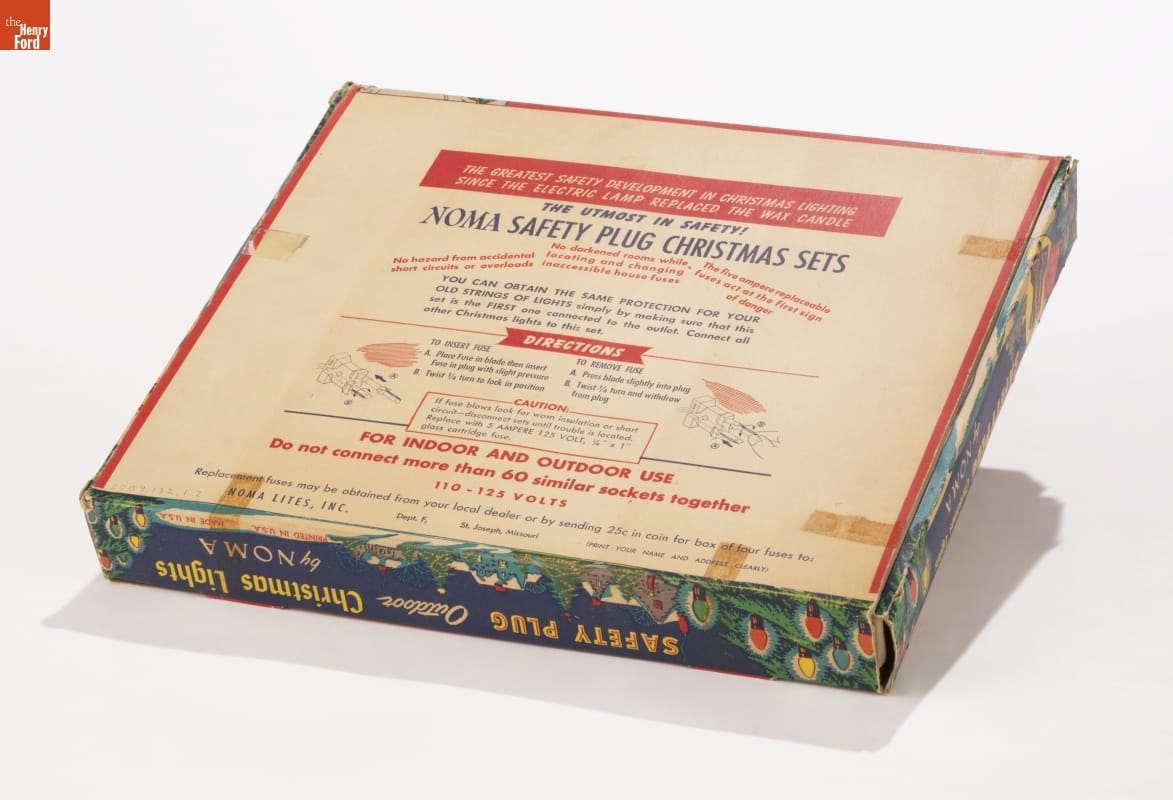THE GREATEST SAFETY DEVELOPMENT IN CHRISTMAS LIGHTING / SINCE THE ELECTRIC LAMP REPLACED THE WAX CANDLE / THE UTMOST IN SAFETY! / NOMA SAFETY PLUG SETS / No hazard from accidental / short circuits or overlaods / No darkened rooms while / locating and changing / inaccessible house fuses /... / Replacement fuses may be obtained from your local dealer or by sending 25 cents in coin for box of four fuses to: NOMA LITES, INC. Dept. F, St. Joseph, Missouri (PRINT YOUR NAME AND ADDRESS CLEARLY)