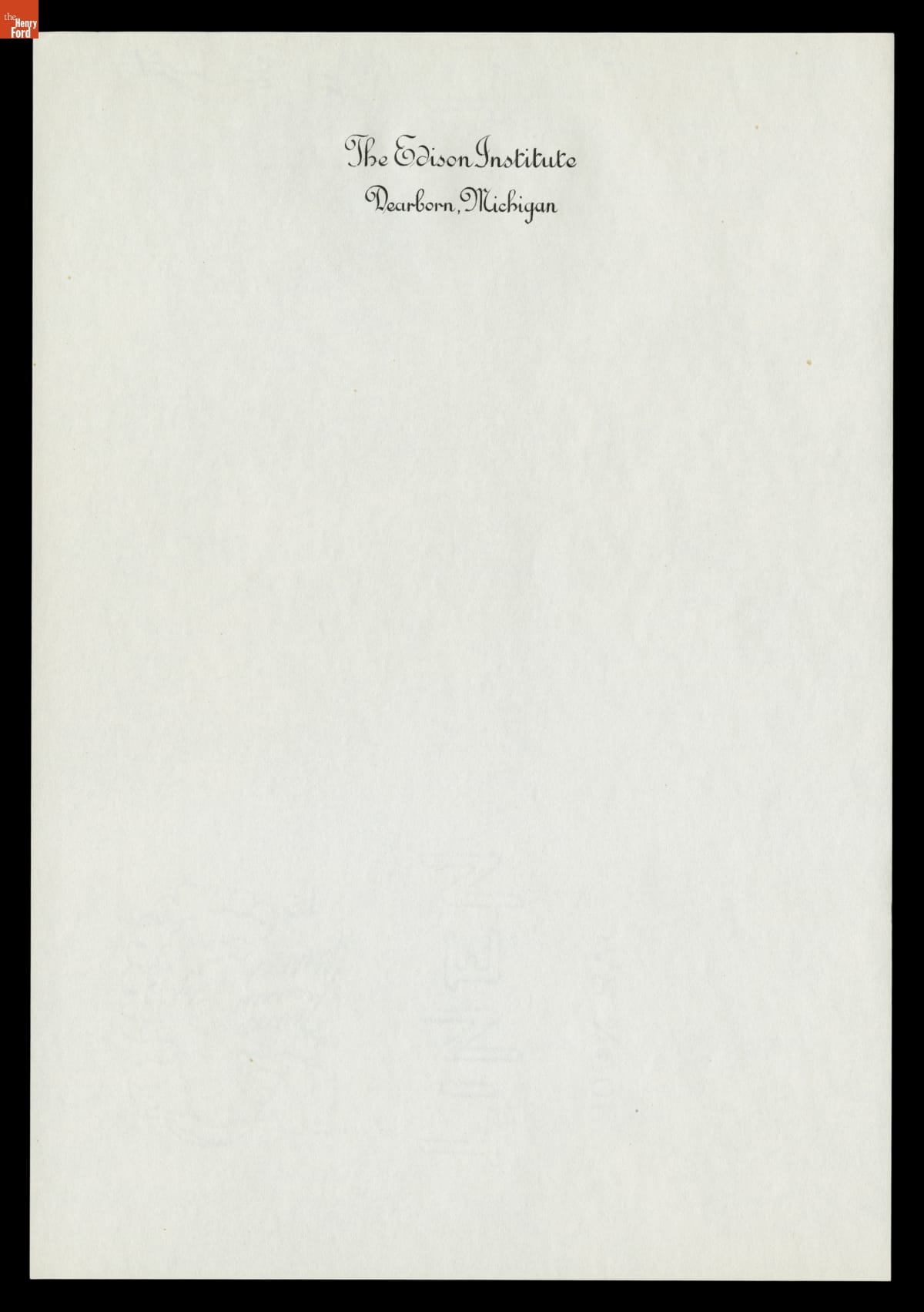 Letterhead Stationery for The Edison Institute, Dearborn, Michigan, circa 1952