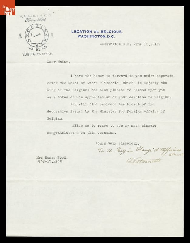 Letter to Clara Ford from the Belgian Legation Announcing She Was Awarded the Queen Elisabeth Medal, June 1919