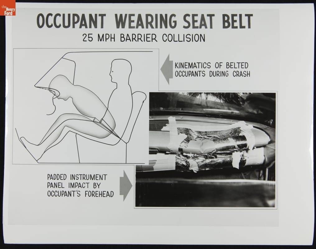 Seat belts were among the most important safety devices in an automobile. As this photo showed, even a low-speed crash could lead to serious injury, whether from broken glass or hard surfaces on the dashboard. Restraints protected people from these dangers. Seat belts were required on all cars sold in the United States starting with the 1968 model year.