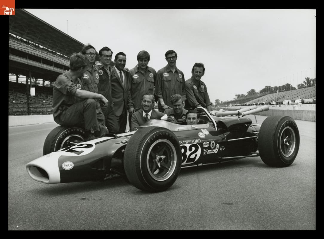 Jim Clark (in car), Colin Chapman (in necktie, kneeling) and the Team Lotus crew posed with Clark's Lotus-Ford Type 38 at Indianapolis Motor Speedway in 1965. Designer Chapman and driver Clark revolutionized the Indy 500 with their rear-engine Formula One style car. It was the very opposite of the front-engine roadsters that dominated the race prior to Clark's 1965 victory.