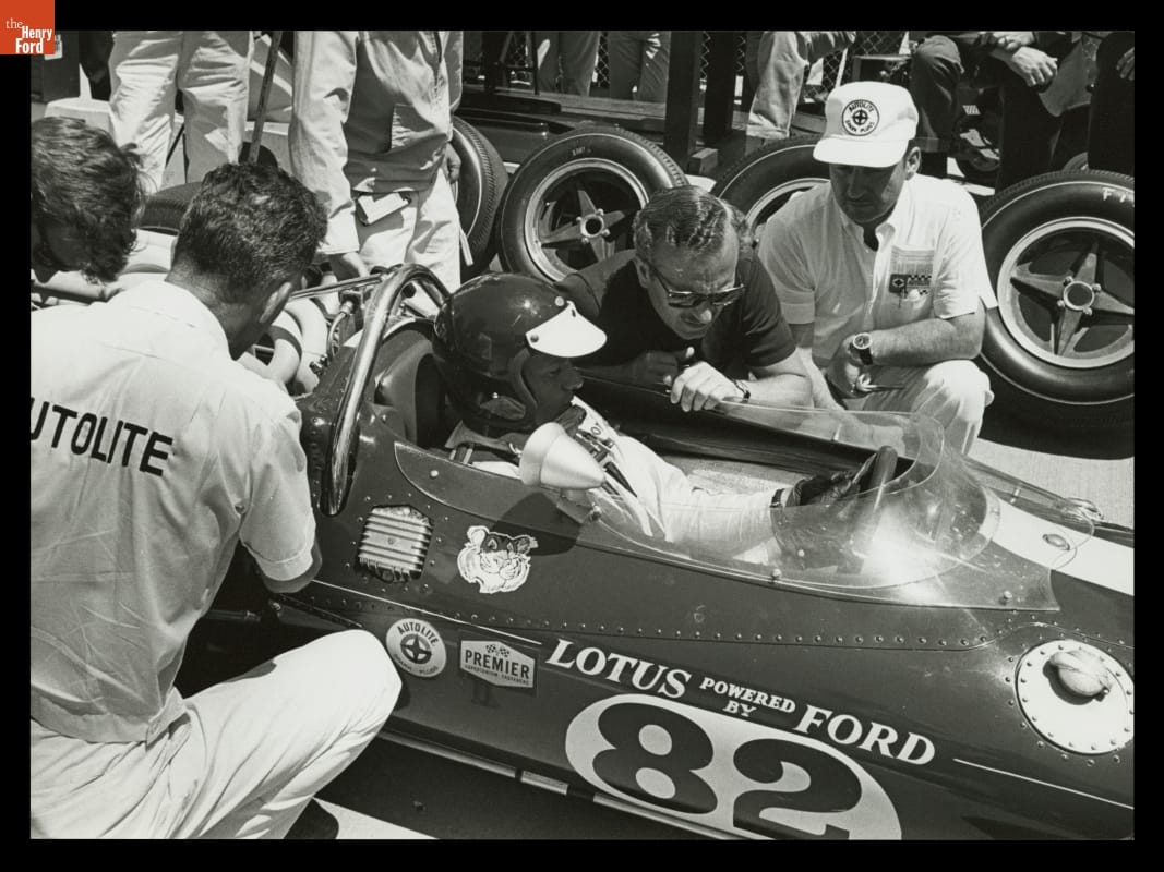 Jim Clark Seated in Lotus Racer, with Colin Chapman and Pit Crew at Indianapolis 500 Race, 1965