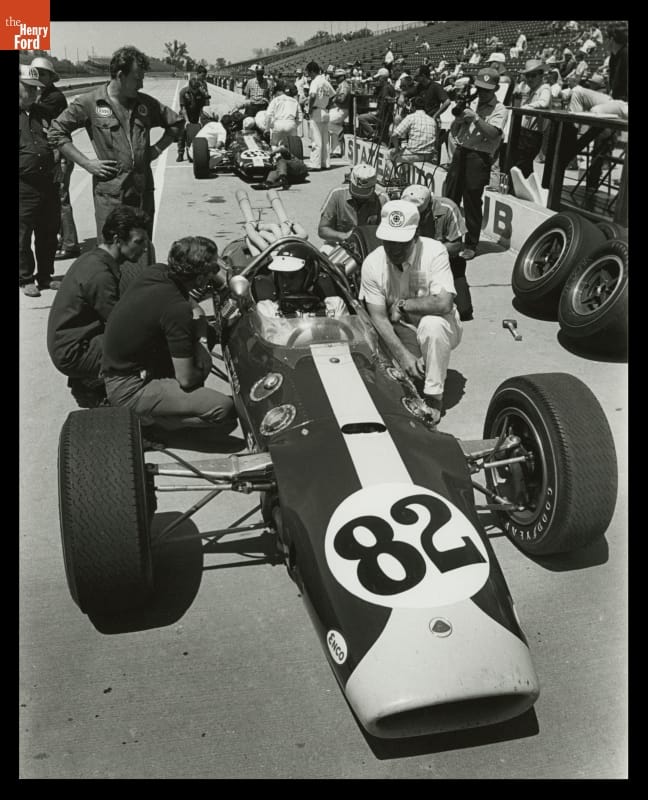 This photograph shows a rear-engine Lotus-Ford Type 38 at a 1965 practice session before the Indianapolis 500 race. Car builder Colin Chapman is seen talking with the eventual winner, driver Jim Clark.
