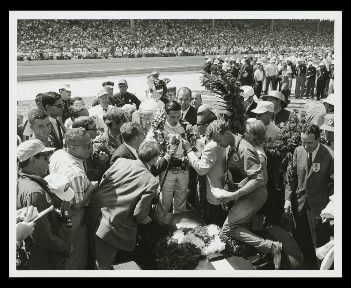 Jim Clark stood in the cockpit of his #82 Lotus-Ford Type 38 immediately after winning the 1965 Indianapolis 500. The Borg-Warner Trophy, the race's official prize, stood behind him. Clark's victory was the first Indy win in a rear-engine car, and it represented a major technological shift in America's premier motor race.