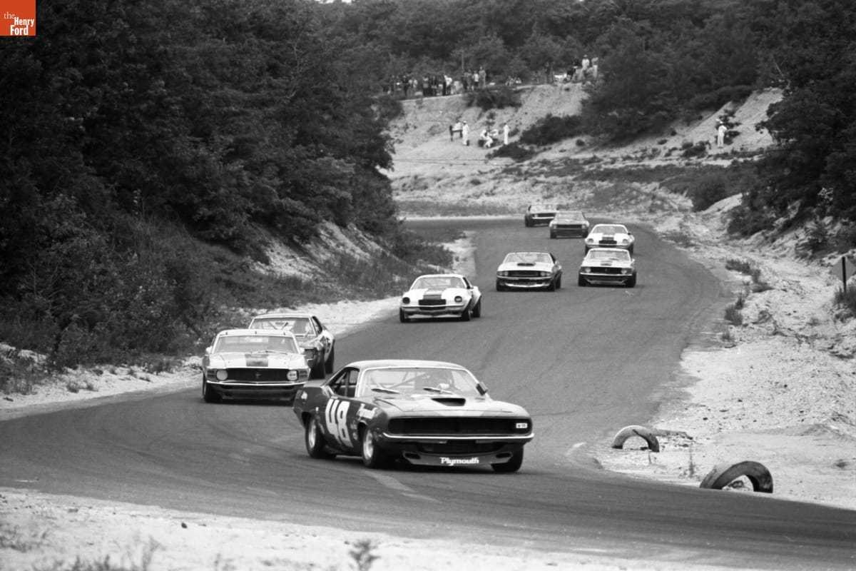 Swede Savage Driving a Plymouth Barracuda in Trans-Am Race at Bridgehampton Raceway, May 1970