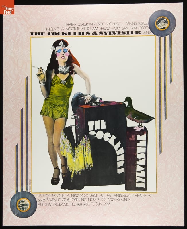 The Cockettes were an influential theater troupe from San Francisco. The group, which consisted of hippies and members of the LGBTQ+ community, produced elaborate drag musicals that subverted societal norms around gender and sexuality. One former Cockette, Sylvester (1947-1988), began a solo singing career in 1971; famous for his falsetto voice and androgynous appearance, he became a beloved disco artist.