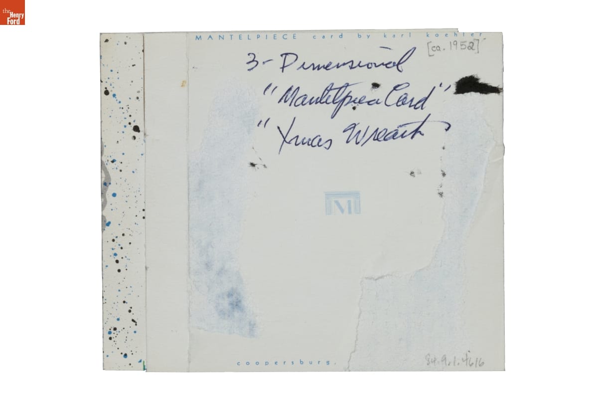Karl Koehler designed three-dimensional Christmas cards in the late 1940s and 1950s. He folded, scored, and snipped paper printed with his artwork, then assembled the cards in his studio. Koehler's creations folded flat for mailing, but when opened they brought unexpected joy with their pop-out shapes. Holiday shoppers found his line of "Mantelpiece" cards at high-end department stores throughout the country.