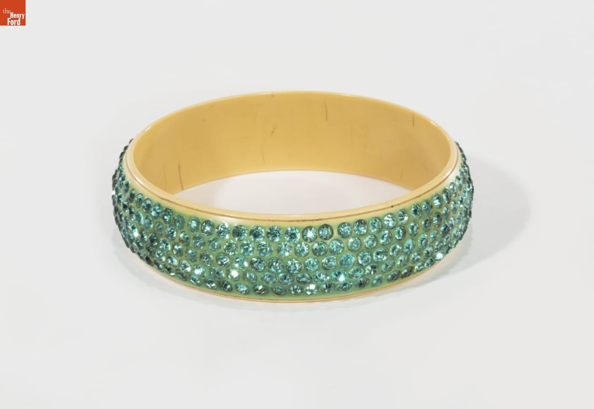 This rhinestone-encrusted bangle bracelet was purchased in a second-hand boutique in the Haight-Ashbury district of San Francisco in the late 1960s, when the area was known as the center of the "hippie" counterculture. Self-described hippies sought to break with mainstream America and create their own society. This garishly decorated bracelet is a good example of hippie aesthetics.