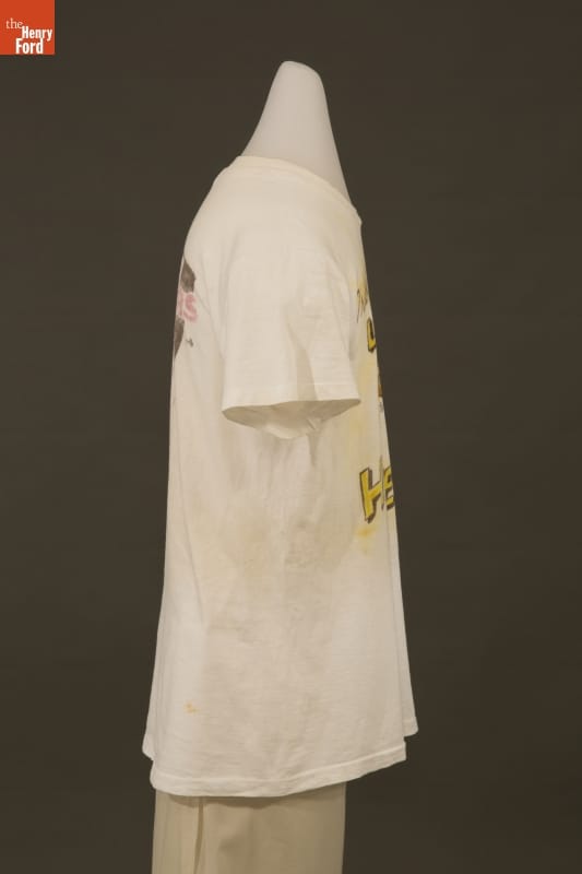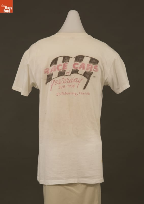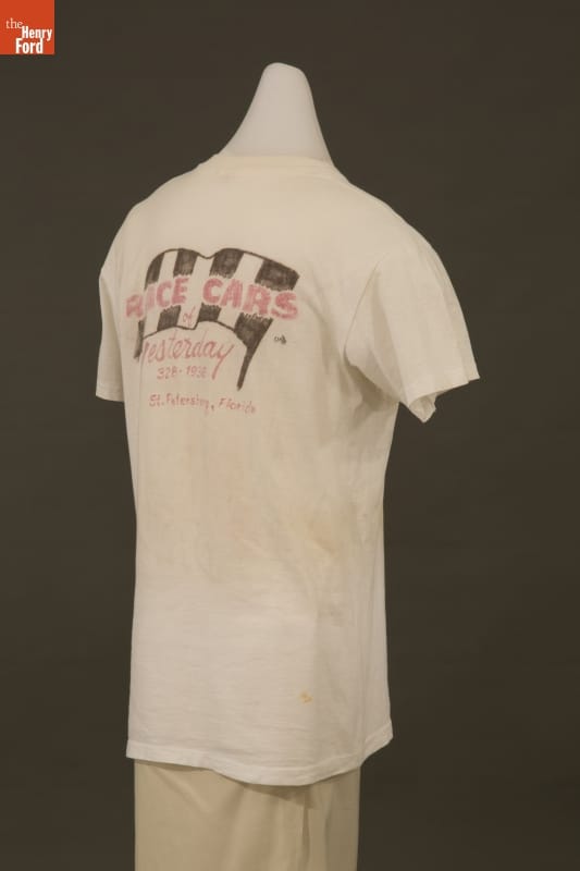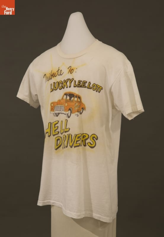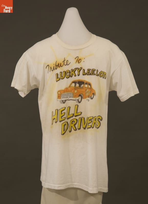 Stunt car driver "Lucky" Lee Lott and his Hell Drivers entertained audiences throughout the United States from 1935 to 1955. Lott crashed, jumped, flipped and demolished thousands of cars during his career. A fan made this t-shirt as a tribute to Lott's daredevil performances.
