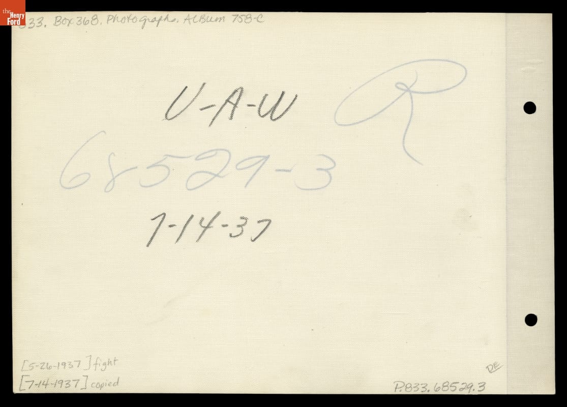 Handwritten in pencil on back: U-A-W / 7-14-37