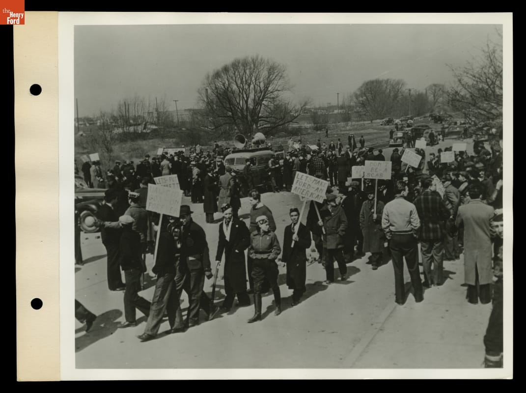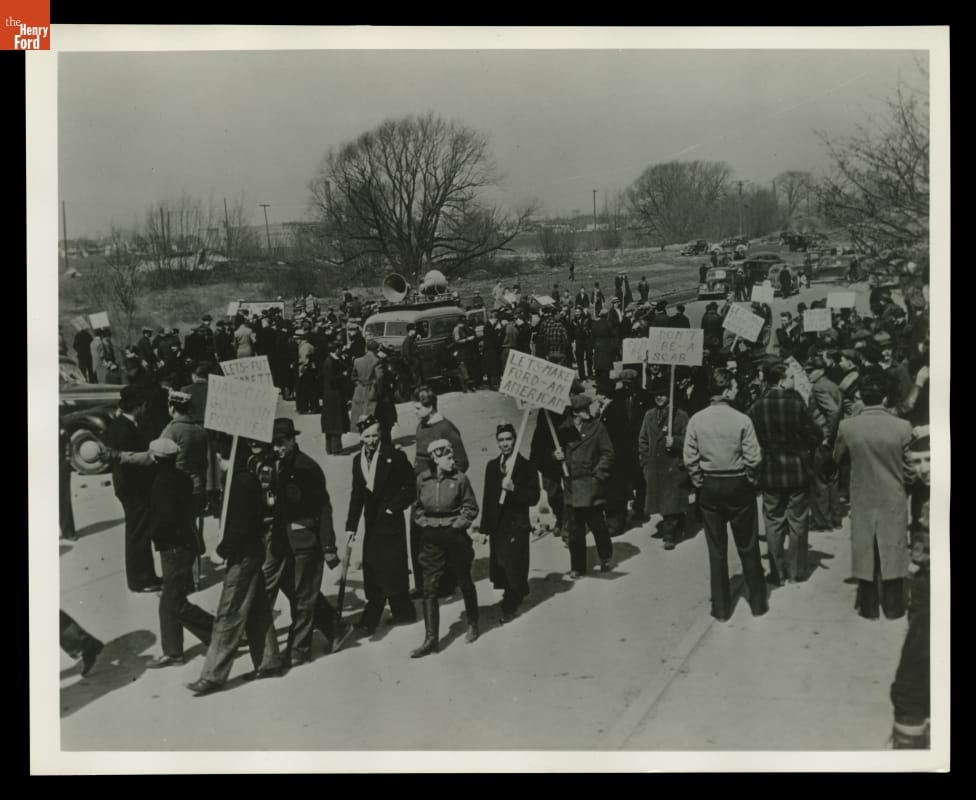 In 1937, the United Auto Workers (UAW) began efforts to unionize Ford Motor Company workers. The long and--at times--violent struggle culminated in a turbulent ten-day strike in April 1941. Here, demonstrators carry placards and wear caps with union buttons outside Ford's Rouge Plant gates. By June 1941 Ford became the last major automotive manufacturer to recognize the UAW and agree to a union contract.