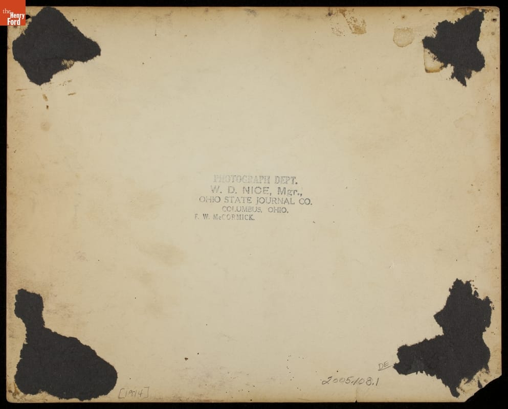 Embossed into image in lower right hand corner: NICE / COL O. Ink stamp on back of image reads: PHOTOGRAPH DEPT. / W.D. NICE, Mgr. / OHIO STATE JOURNAL CO. / COLUMBUS, OHIO / F.W. McCORMICK.