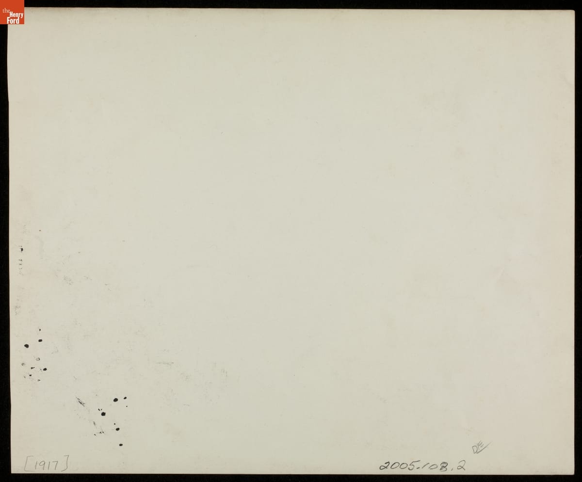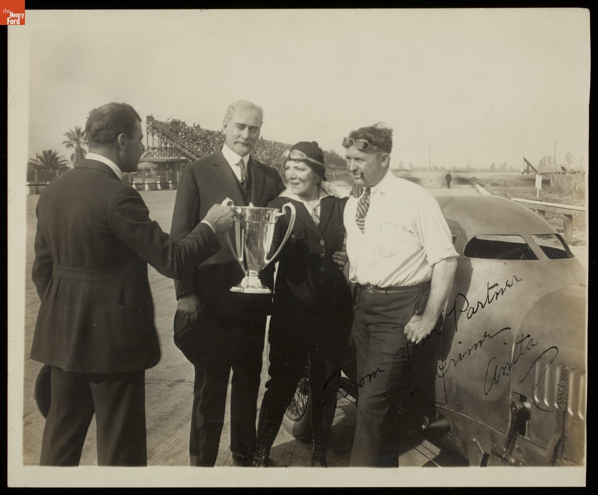 Film star and daredevil Anita King receives a trophy alongside racing hero Barney Oldfield (in white shirt) at Ascot Speedway in 1917. Behind them is Oldfield's streamlined race car, the Miller "Golden Submarine." The two celebrities acted in some of the same movies and made publicity appearances together. King autographed this photograph for Oldfield, calling herself his "partner in crime."