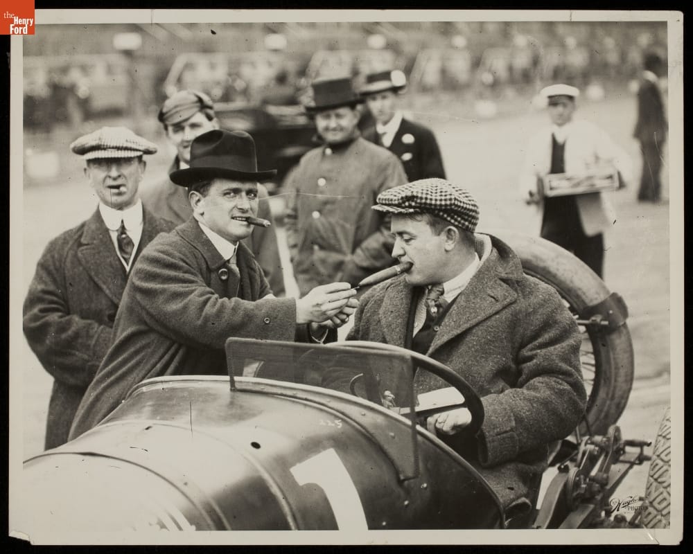 Lincoln Beachey Lighting Barney Oldfield's Cigar, 1914