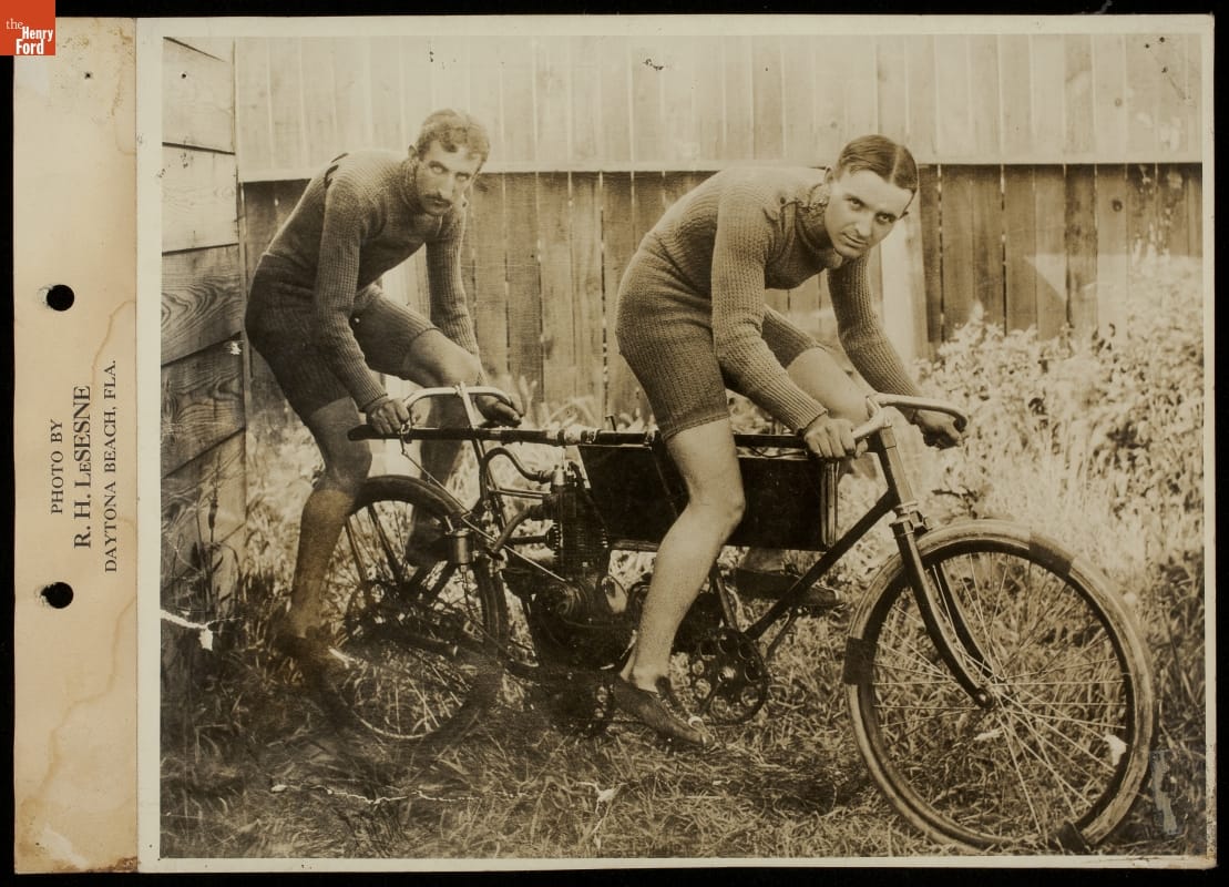 Barney Oldfield and Cyclist on an Orient Motorized Tandem Bicycle, 1902