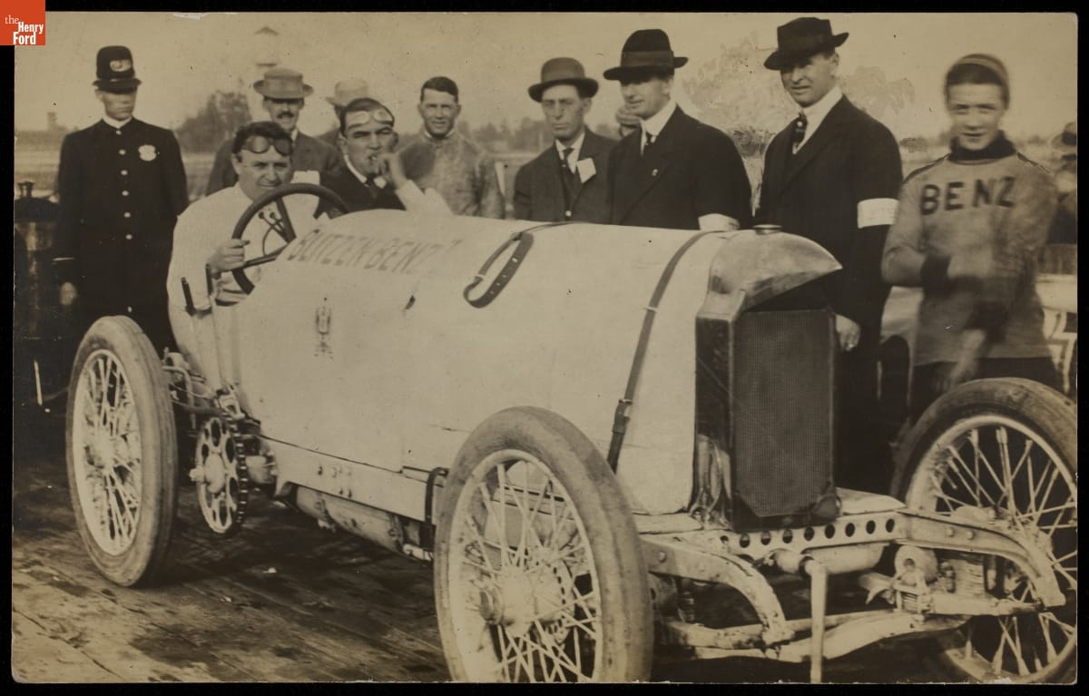 In 1910, Barney Oldfield piloted the "Blitzen Benz." This powerful, German-made machine was built for speed. With Oldfield behind the wheel, the vehicle broke numerous track records throughout the year, including the world's land speed record. This photo shows the auto racing legend behind the wheel with former boxing champion Jim Jeffries.
