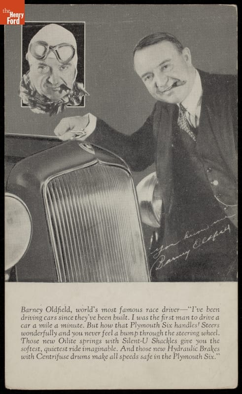 Barney Oldfield found ways to stay in the public spotlight well after his last professional race in 1918. The showman attended and refereed racing meets, ran a tire company, drove a tractor faster than a mile a minute, and appeared in movies and on the radio. In the mid-1930s, Oldfield joined with Plymouth to promote the car's performance and safety features.