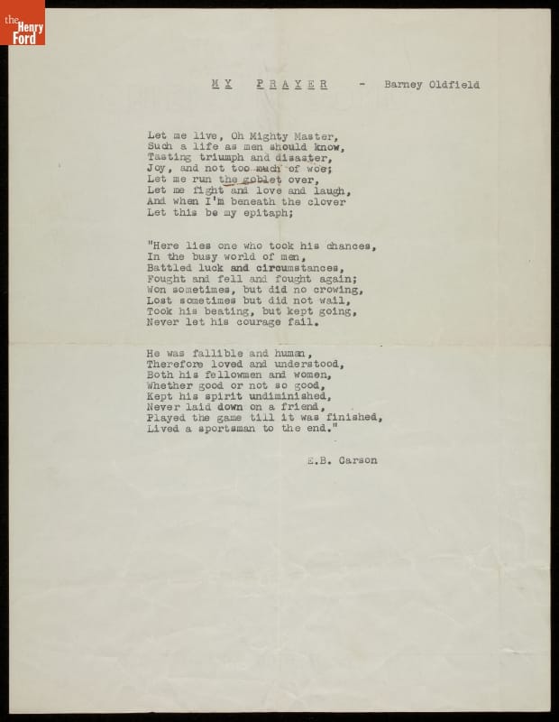 Typed, entitled: MY PRAYER - Barney Oldfield: First few lines: Let me live, Oh Mighty Master, / Such a life as men should know, / Tasting triumph and disaster, / Joy, and not too much of woe; ... Typed at bottom of prayer: E. B. Carson