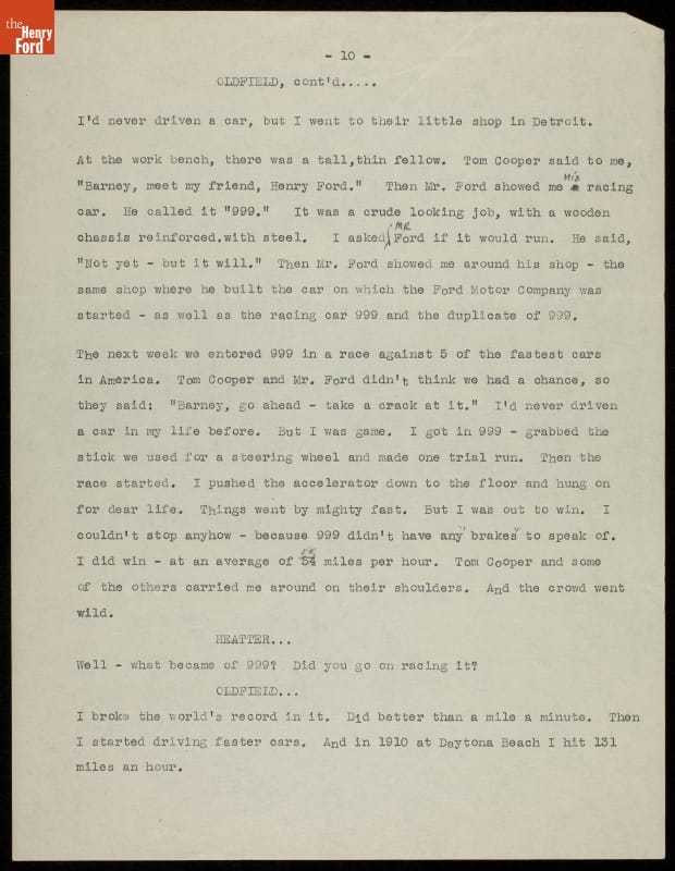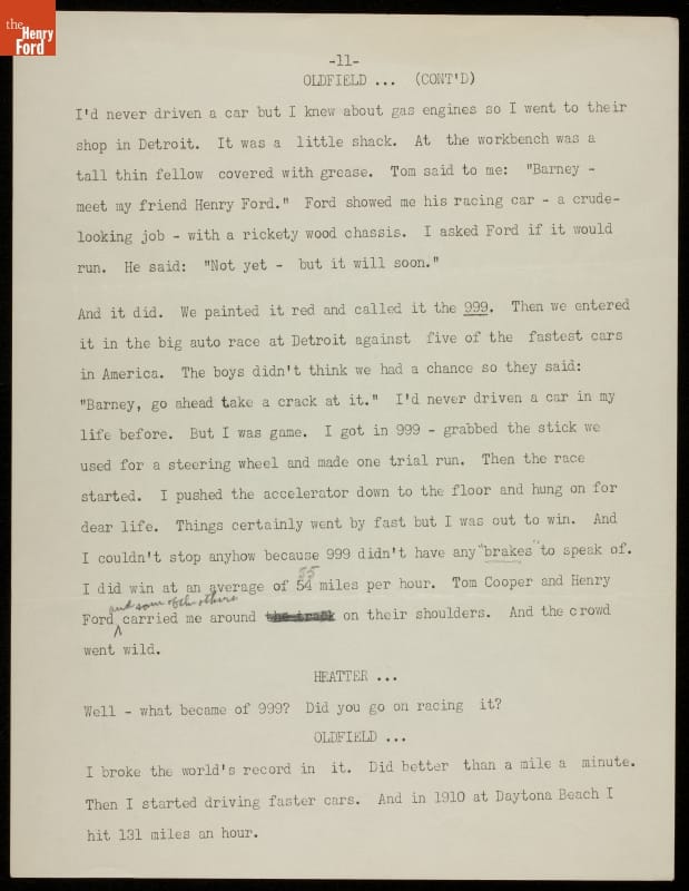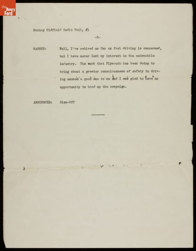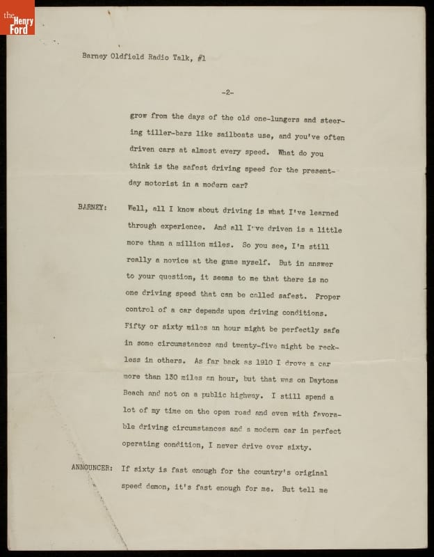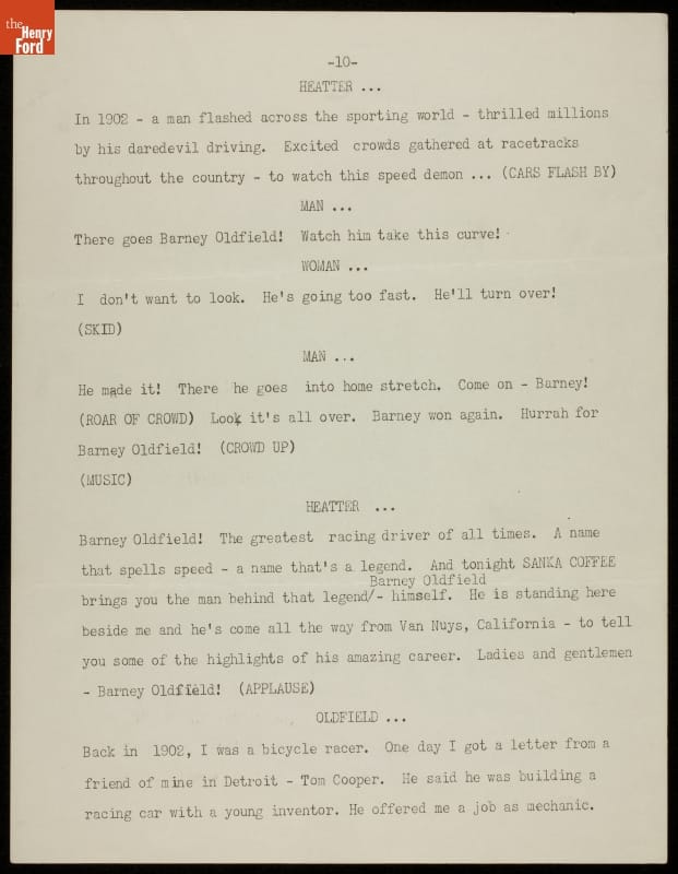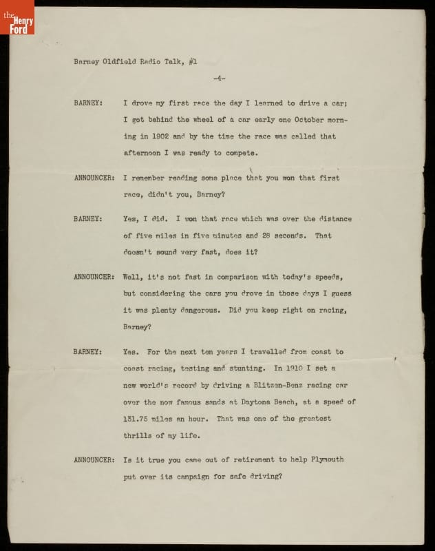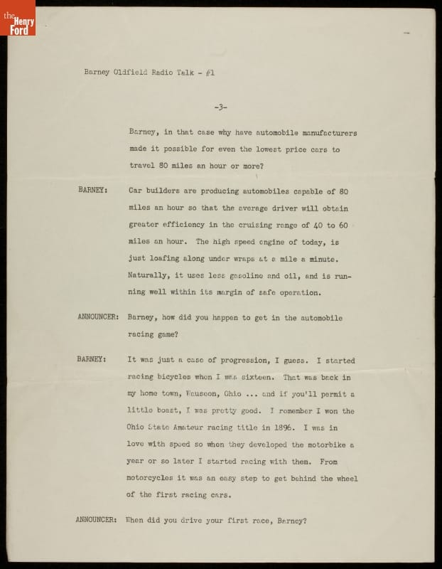 Barney Oldfield found ways to stay in the public spotlight well after his last professional race in 1918. The showman attended and refereed race competitions, ran a tire company, drove a tractor faster than a mile a minute, and appeared in movies and on the radio. In these radio scripts from the mid-1930s Oldfield recounts his racing career and accomplishments.