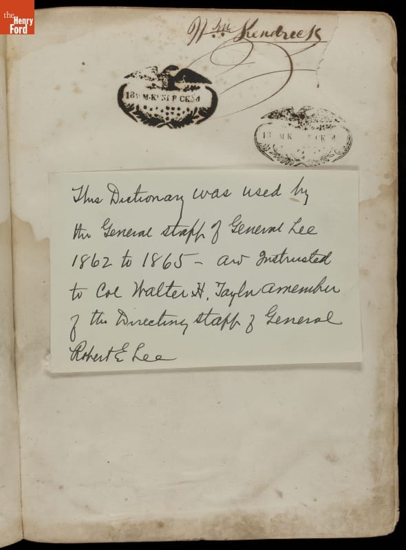 Confederate General Robert E. Lee's staff used this dictionary from 1862 to 1865. After the Civil War, it was given to Lieutenant Colonel Walter H. Taylor. As chief aide-de-camp to Robert E. Lee, Taylor wrote countless dispatches and orders for Lee.
