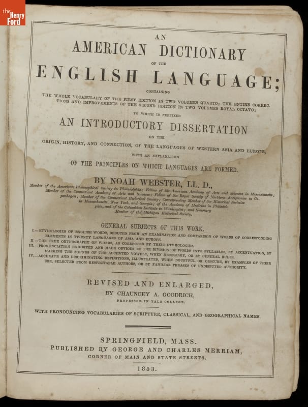 AN/ AMERICAN DICTIONARY/ OF THE/ ENGLISH LANGUAGE;/.../ BY NOAH WEBSTER, LL. D./.../ SPRINGFIELD, MASS./ PUBLISHED BY GEORGE AND CHARLES MERRIAM,/ CORNER OF MAIN AND STATE STREETS./ 1853.