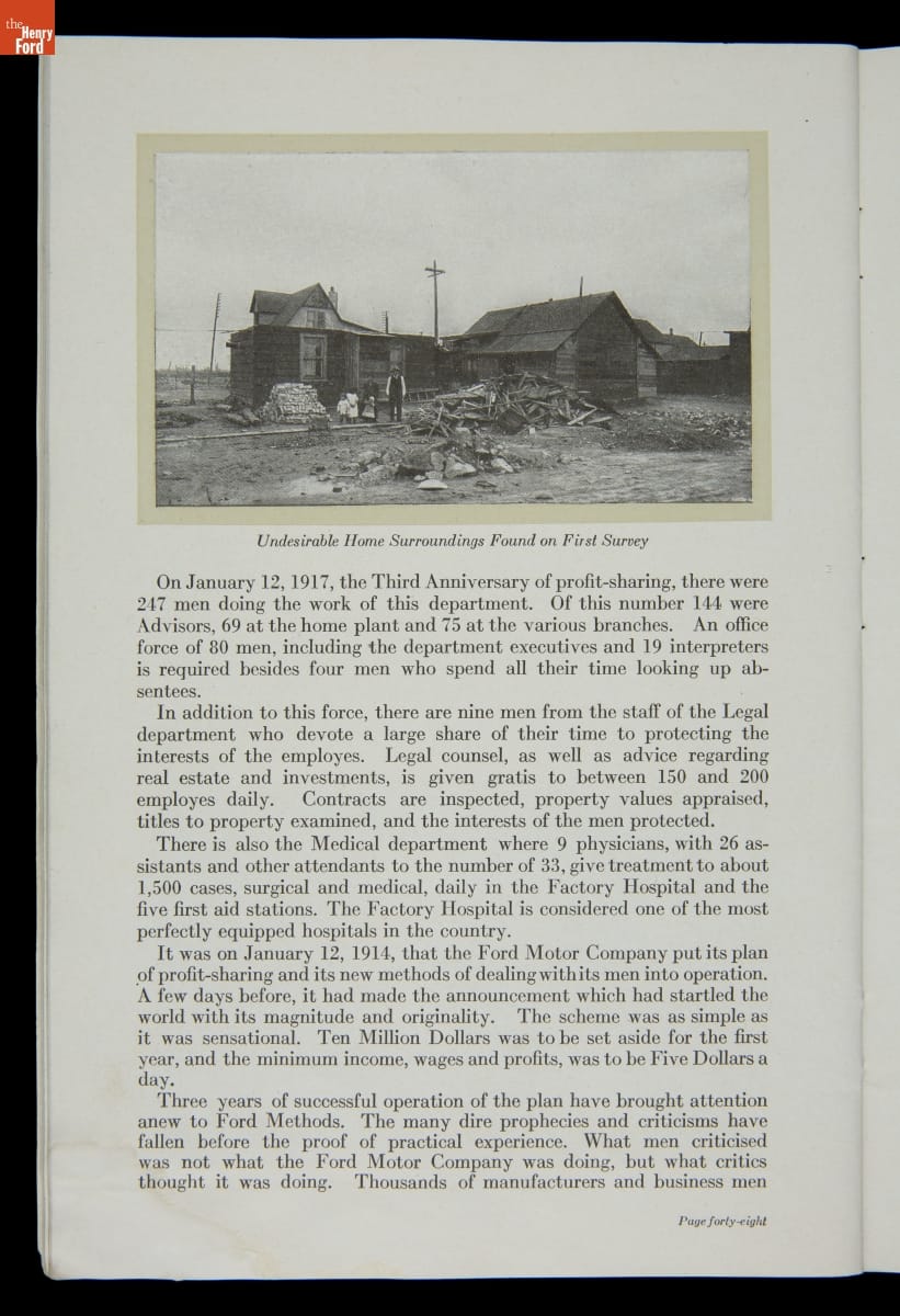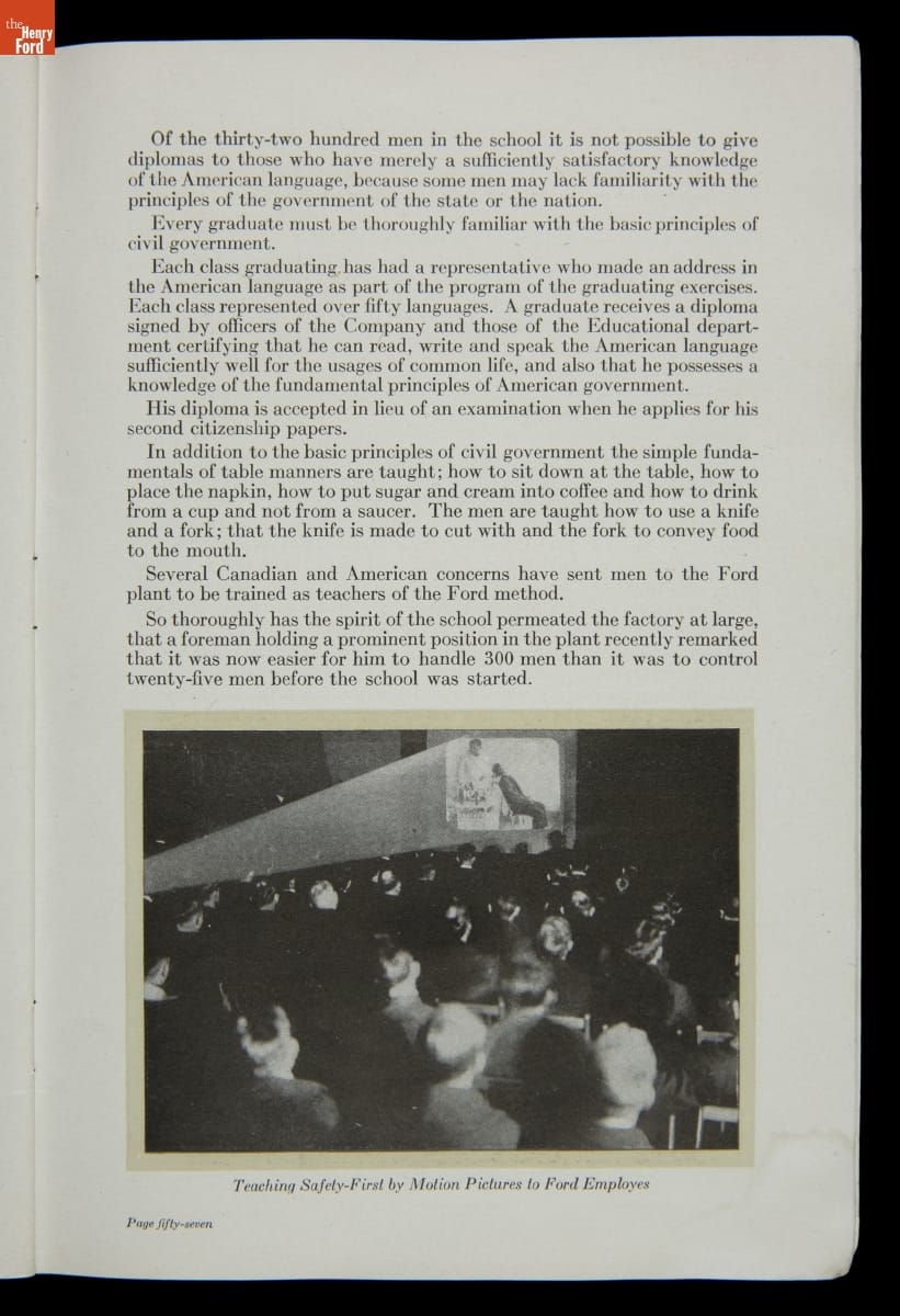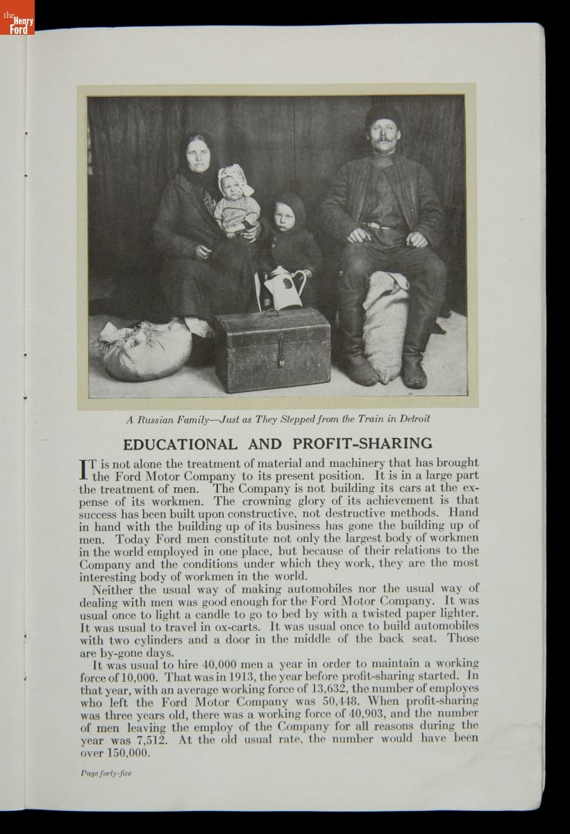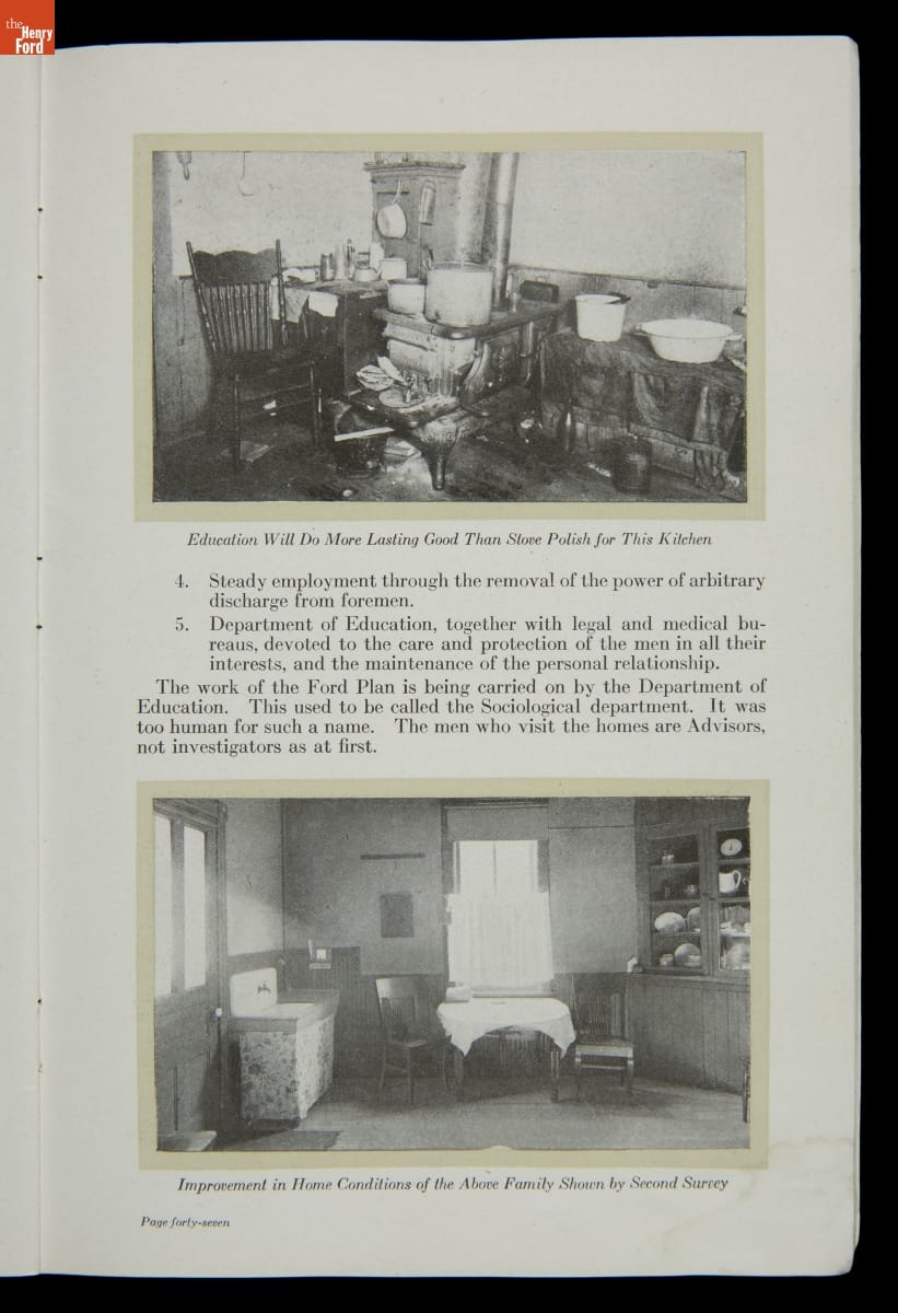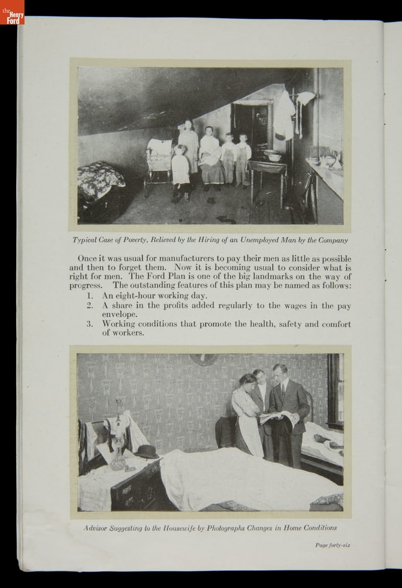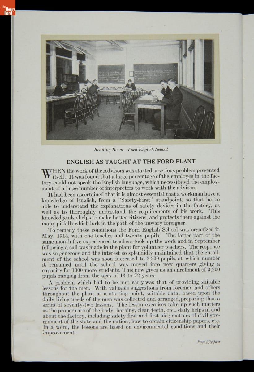 Beyond revolutionizing America's industrial production, Henry Ford and other managers at Ford Motor Company instituted a wide-reaching corporate welfare program that opened up the most intimate and personal details of employee's personal, family, and financial life to investigators from the Sociological Department. After the announcement of the $5 per day profit sharing plan in January 1914, Henry Ford wanted to ensure that employees, many of whom were non-English speaking immigrants, did not squander the funds. To this end, the Ford Sociological Department was created to investigate and monitor the personal and work lives of employees to the extent that investigators (later called Advisors) conducted home visits, checked bank deposits, and monitored children's school attendance as well as divorce filings. In addition, the Sociological Department advisors provided hygiene instruction, financial and legal advice, and worked with the English School to teach Ford's immigrant workers English.
