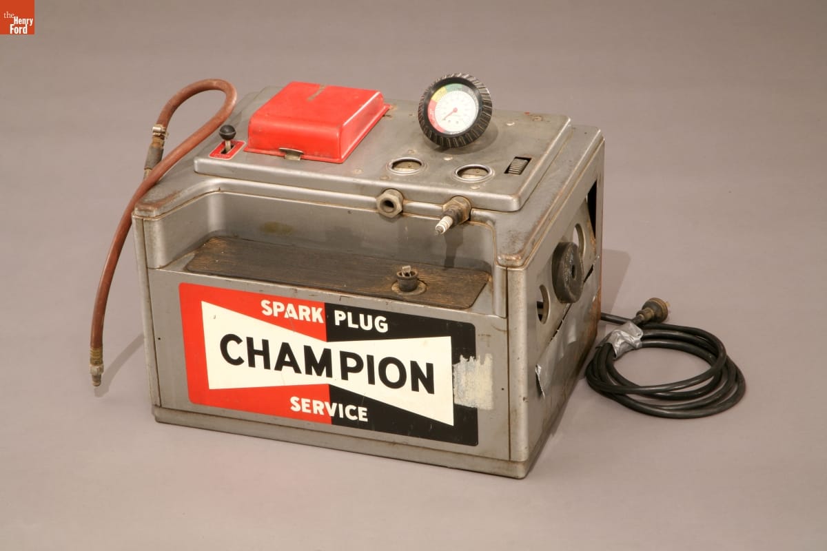 Spark plugs ignite the air-fuel mixture in an internal combustion engine's cylinders. High voltage jumps across a gap between two electrodes on the plug's bottom and creates a spark. Racing driver Bobby Unser used this spark plug tester at the Unser garage in Albuquerque, New Mexico.